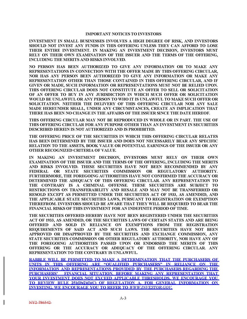 Rabble will be permitted to make a determination that the purchasers of unitS in this offering are “qualified purchasers” in reliance on the information and representations provided by the PURCHASERS REGARDING THE PURCHASERS’ financial situation. Before making any representation that your investment does not exceed applicable thresholds, we encourage you to review RulE 251(d)(2)(i)(C) of Regulation A. For general information on investing, we encourage you to refer to www.investor.gov.
