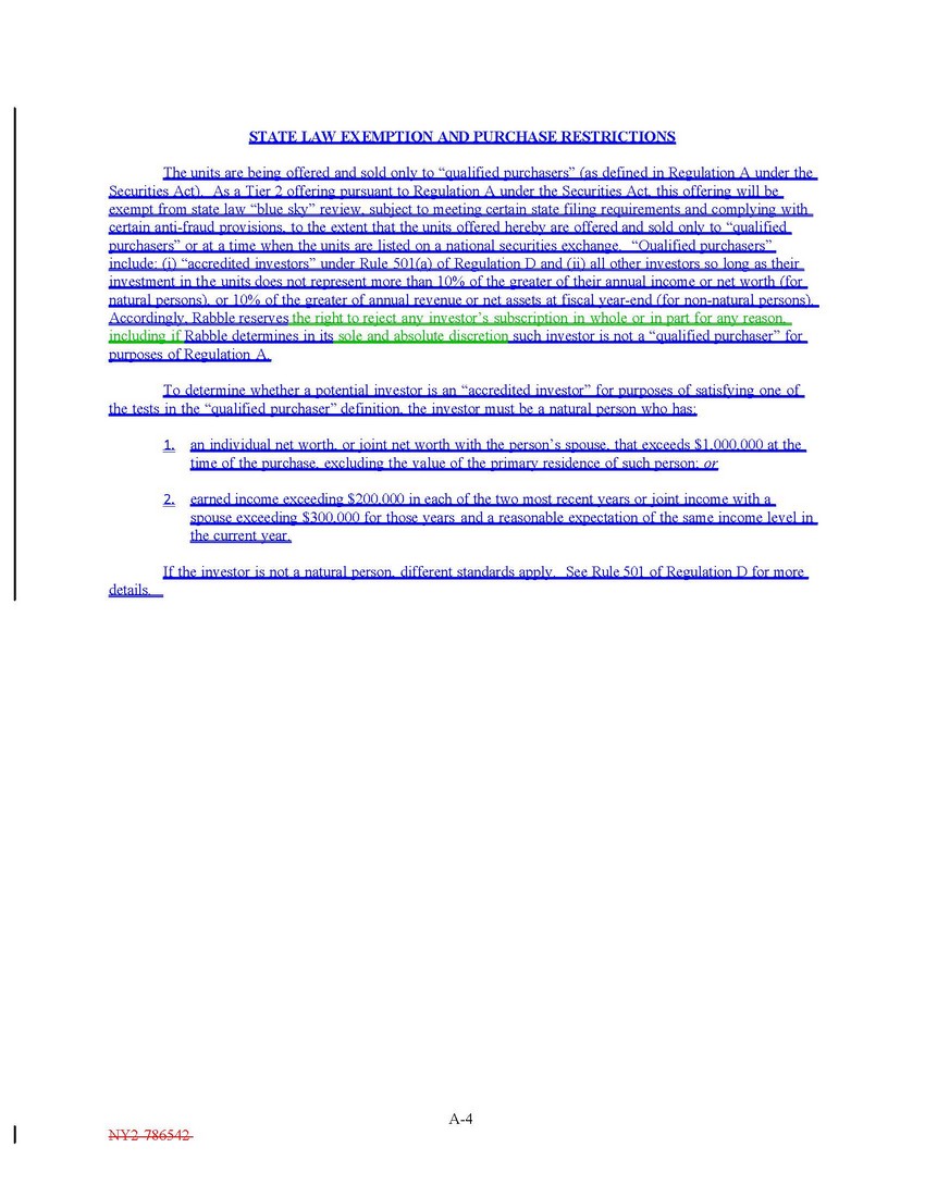 The units are being offered and sold only to “qualified purchasers” (as defined in Regulation A under the Securities Act). As a Tier 2 offering pursuant to Regulation A under the Securities Act, this offering will be exempt from state law “blue sky” review, subject to meeting certain state filing requirements and complying with certain anti-fraud provisions, to the extent that the units offered hereby are offered and sold only to “qualified purchasers” or at a time when the units are listed on a national securities exchange. “Qualified purchasers” include: (i) “accredited investors” under Rule 501(a) of Regulation D and (ii) all other investors so long as their investment in the units does not represent more than 10% of the greater of their annual income or net worth (for natural persons), or 10% of the greater of annual revenue or net assets at fiscal year-end (for non-natural persons). Accordingly, Rabble reserves the right to reject any investor’s subscription in whole or in part for any reason, including if Rabble determines in its sole and absolute discretion such investor is not a “qualified purchaser” for purposes of Regulation A.