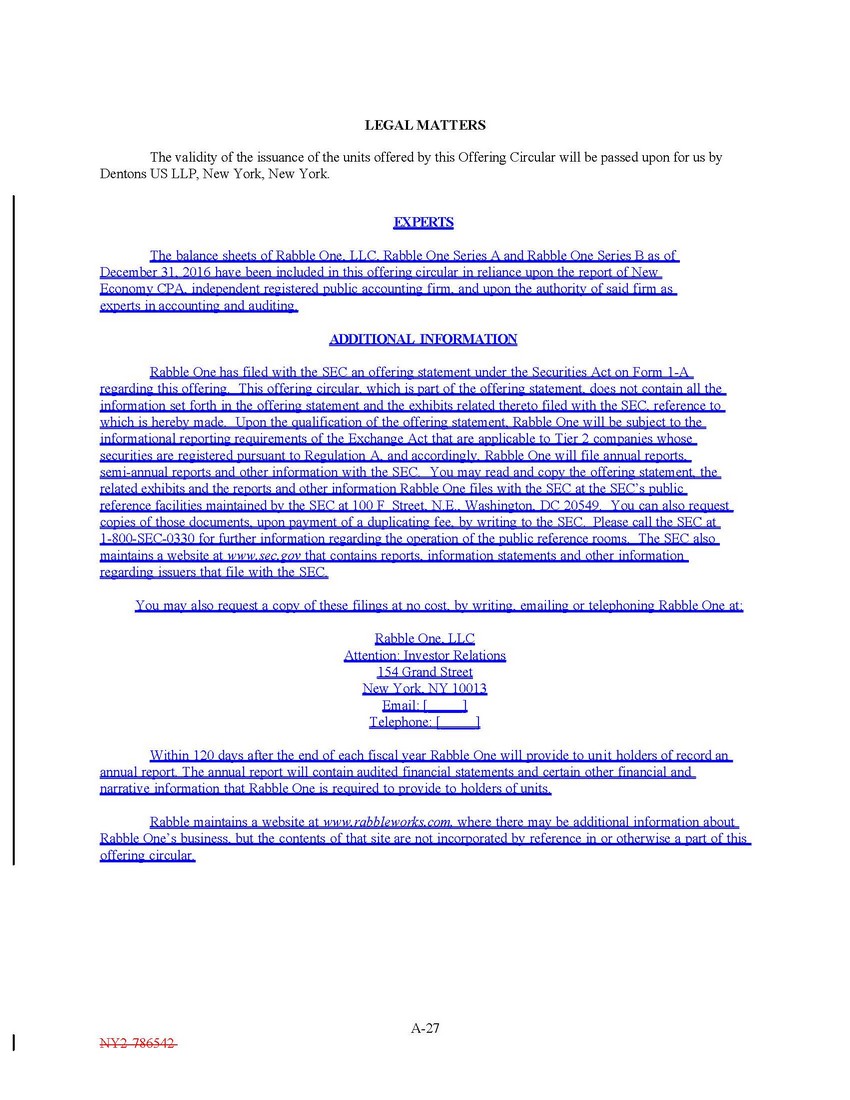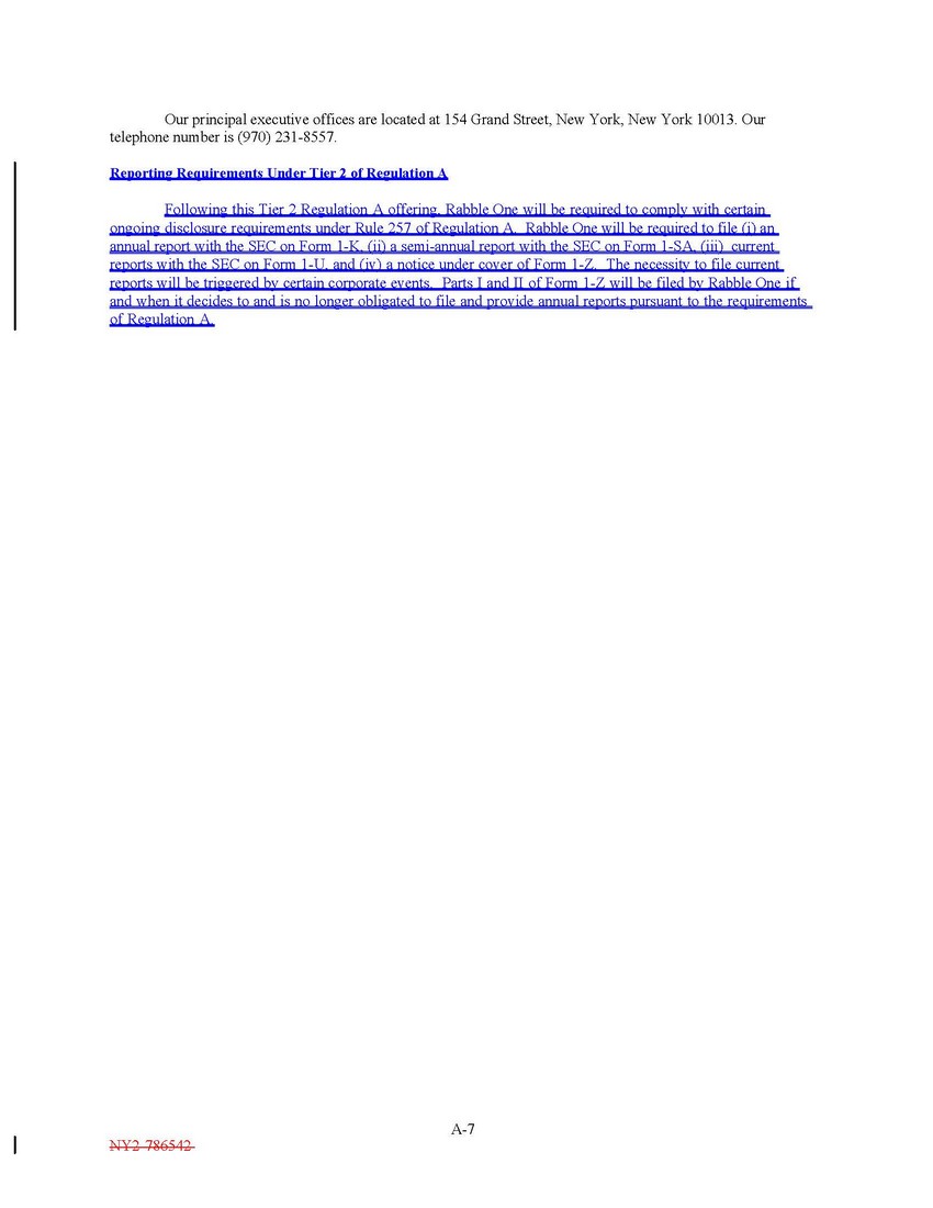 0001144204-17-021815.txt : 20170425 0001144204-17-021815.hdr.sgml : 20170425 20170424210832 ACCESSION NUMBER: 0001144204-17-021815 CONFORMED SUBMISSION TYPE: 1-A PUBLIC DOCUMENT COUNT: 89 FILED AS OF DATE: 20170425 DATE AS OF CHANGE: 20170424 FILER: COMPANY DATA: COMPANY CONFORMED NAME: Rabble One, LLC CENTRAL INDEX KEY: 0001690021 STANDARD INDUSTRIAL CLASSIFICATION: REAL ESTATE [6500] IRS NUMBER: 813874736 STATE OF INCORPORATION: DE FISCAL YEAR END: 1231 FILING VALUES: FORM TYPE: 1-A SEC ACT: 1933 Act SEC FILE NUMBER: 024-10694 FILM NUMBER: 17779433 BUSINESS ADDRESS: STREET 1: 154 GRAND STREET CITY: NEW YORK STATE: NY ZIP: 10013 BUSINESS PHONE: 970-231-8557 MAIL ADDRESS: STREET 1: 154 GRAND STREET CITY: NEW YORK STATE: NY ZIP: 10013 1-A 1 primary_doc.xml 1-A LIVE 0001690021 XXXXXXXX Rabble One, LLC DE 2016 0001690021 6500 81-3874746 2 5 154 Grand Street New York NY 10013 970-231-8557 Anna Pinedo Other 0.00 0.00 0.00 0.00 0.00 0.00 0.00 0.00 0.00 0.00 0.00 0.00 0.00 0.00 0.00 0.00 Fox Rothschild LLP None 0 000000000 N/A None 0 000000000 N/A None 0 000000000 N/A true true Tier2 Audited Equity (common or preferred stock) Y N Y Y N N 6050 0 100.0000 605000.00 0.00 0.00 0.00 605000.00 Morrison & Foerster LLP 0.00 Morrison & Foerster LLP 0.00 605000.00 Rabble will offer the units directly through its website. Anticipated fees to be updated. true AL AK AZ AR CA CO CT DE FL GA HI ID IL IN IA KS KY LA ME MD MA MI MN MS MO MT NE NV NH NJ NM NY NC ND OH OK OR PA RI SC SD TN TX UT VT VA WA WV WI WY DC PR true PART II AND III 2 v464873_partiiandiii.htm PART II AND III