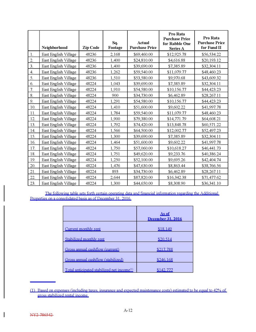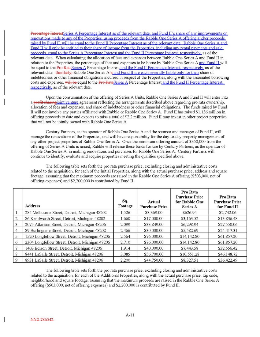 As noted in the Company’s prior comment response letter, at the closing of the offering of Series A Units (the “Series A offering”), Jane Q, Inc., d/b/a Rabble (“Rabble”), as the manager of Rabble One Series A, and Century Partners, as the operator of Rabble One Series A, will consider the amount of funds raised by Detroit Real Estate Value Fund II (“Fund II”) and the proceeds raised in the Series A offering for purposes of determining the pro rata ownership interests of each of Rabble One Series A and Fund II in the Initial Properties and the Additional Properties (collectively, the “Properties,” and each, a “Property”). The proceeds from the Series A offering will be used to (i) purchase Rabble One Series A’s pro rata ownership interest in the Properties and (ii) renovate the Properties. The pro rata ownership interest to be held by Rabble One Series A in the Properties will correspond to the ratio represented by (i) the aggregate net proceeds raised in the Series A offering, compared to (ii) the sum of (A) the aggregate net proceeds raised in the Series A offering and (B) the aggregate dollar amount raised by Fund II as of any date subsequent to the date hereof through the closing of Fund II in October 2018 (the “Series A Percentage Interest”). The pro rata ownership interest to be held by Fund II in the Properties will correspond to the ratio represented by (i) the aggregate dollar amount raised by Fund II as of any date subsequent to the date hereof through the closing of Fund II in October 2018, compared to (ii) the sum of (A) the aggregate net proceeds raised in the Series A offering and (B) the aggregate dollar amount raised by Fund II as of any date subsequent to the date hereof through the closing of Fund II in October 2018 (the “Fund II Percentage Interest”).