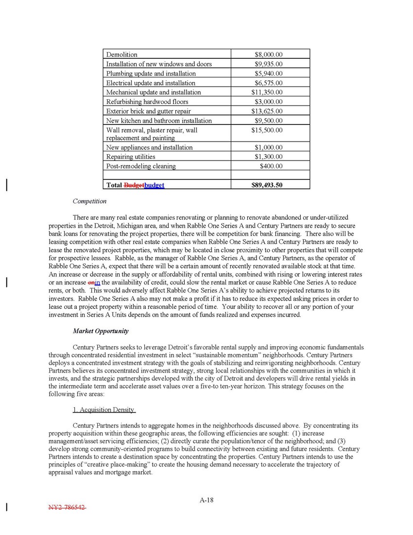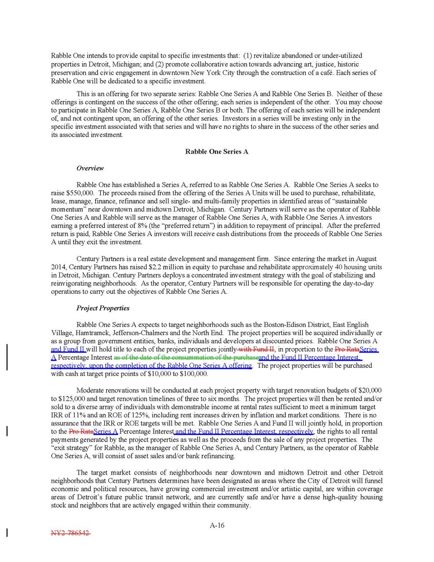 As of the date hereof, there are no material adverse developments with respect to Fund I. However, there are many real estate companies renovating or planning to renovate abandoned or under-utilized properties in the Detroit, Michigan area, and there will be competition for bank financing for renovating project properties as mentioned in “Risk Factors—Risks Related to Rabble One Series A—Rabble One Series A’s portfolio may not be diversified in its investments as Century Partners may choose, in its sole discretion as the operator, to invest in any type of real estate asset” on pages II-25 and 26.  If Fund I is unable to obtain bank financing, or experiences delays in obtaining bank financing or alternative financing, Fund I’s ability to make distributions to investors and its net operating yield would be adversely affected. There also will be leasing competition with other real estate companies, which may be located in close proximity to other properties that will compete for prospective lessees. An increase or decrease in the supply or affordability of rental units, combined with rising or lowering interest rates or an increase in the availability of credit, could slow the rental market or cause Fund I to reduce rents, or both. This would also adversely affect Fund I’s net operating yield. The disclosures on page A-19 have been revised accordingly.