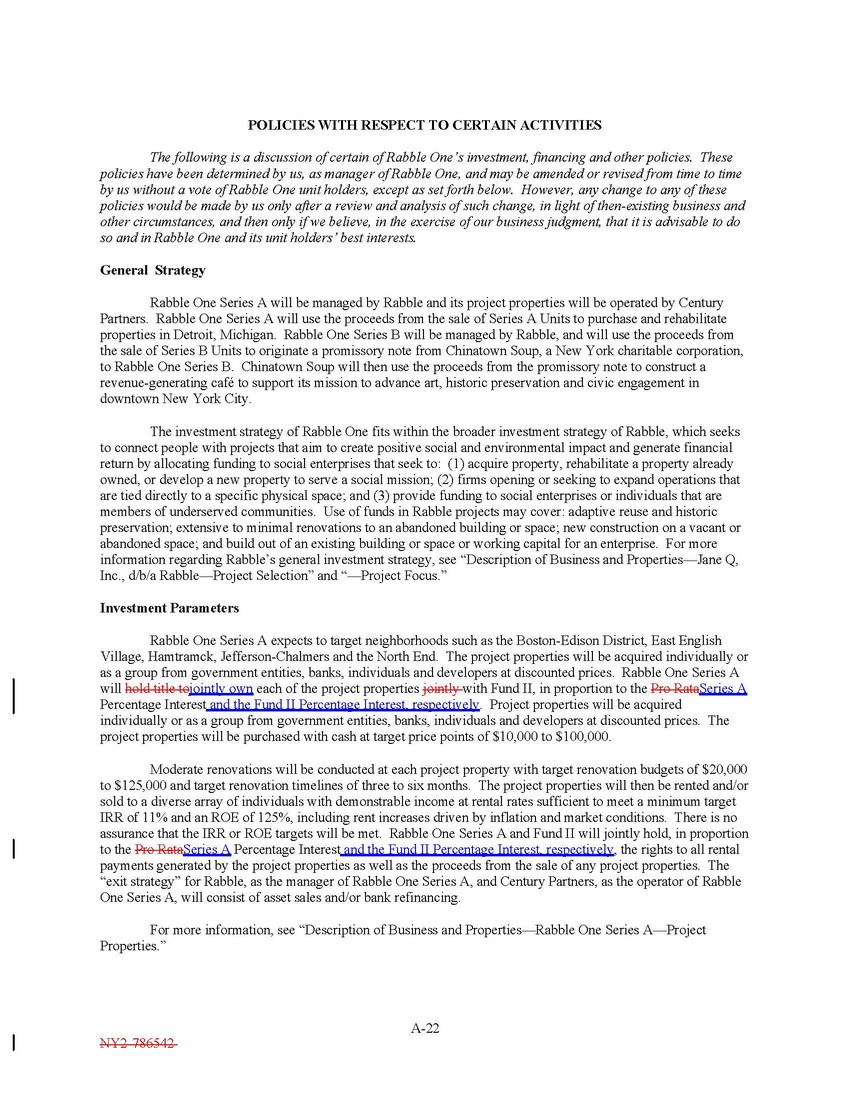 As described under “Rabble One Series B—Overview” in the Amendment, Rabble One Series B will be invested by the manager, Rabble One, in a promissory note to be issued by Chinatown Soup, which is a registered New York State charitable corporation as defined in Section 102(5)(a) of the New York Not-For-Profit Corporation Law.
