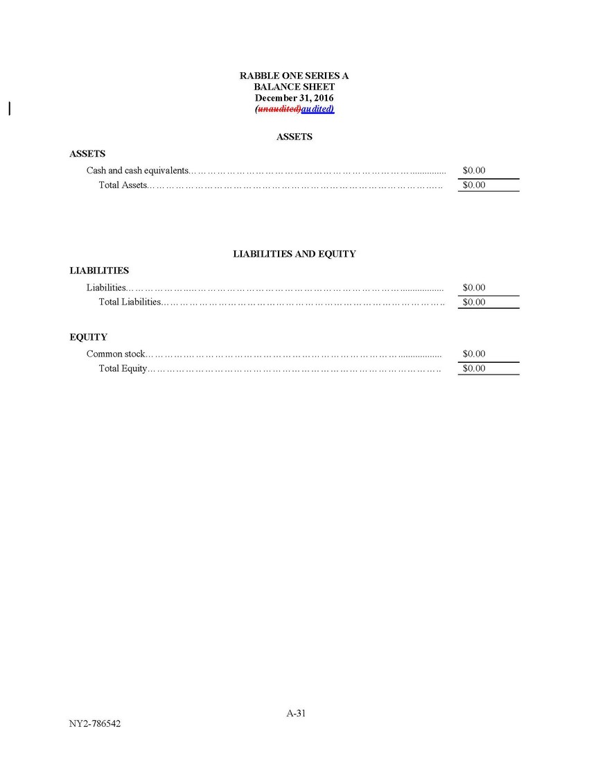 Placeholders for the opening balance sheets of Rabble One Series A and Rabble One Series B have been included on pages F-4 and F-7. Opening balance sheets for Rabble One Series A and Rabble One Series B will be included in the next amendment to the Offering Statement.