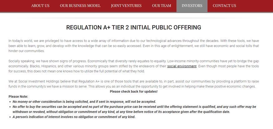 Social Investment Holdings, 5727 NW 17 Ave., Miami, Florida 33142 (305) 351-2407)