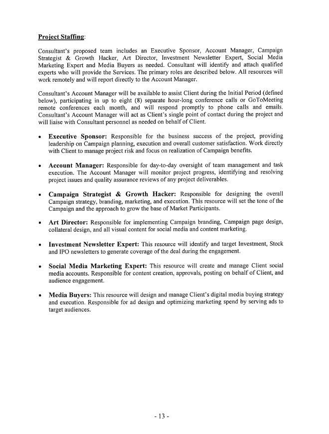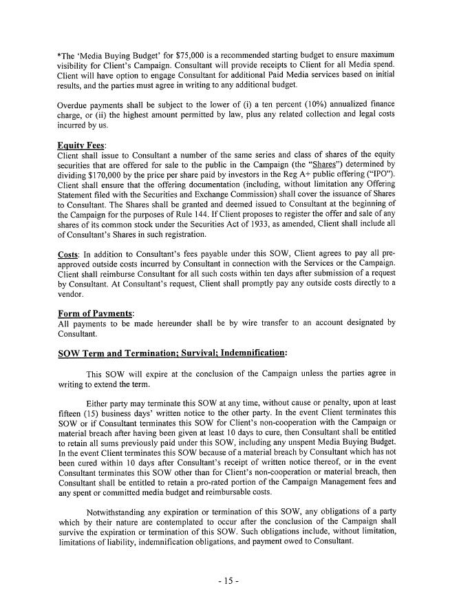 In addition, we have engaged WhoYouKnow LLC, a California limited liability company, d/b/a CrowdfundX (“Offering Campaign Consultant”), to assist us in the planning, public relations and promotion of this Offering, utilizing the BANQ Online Platform.