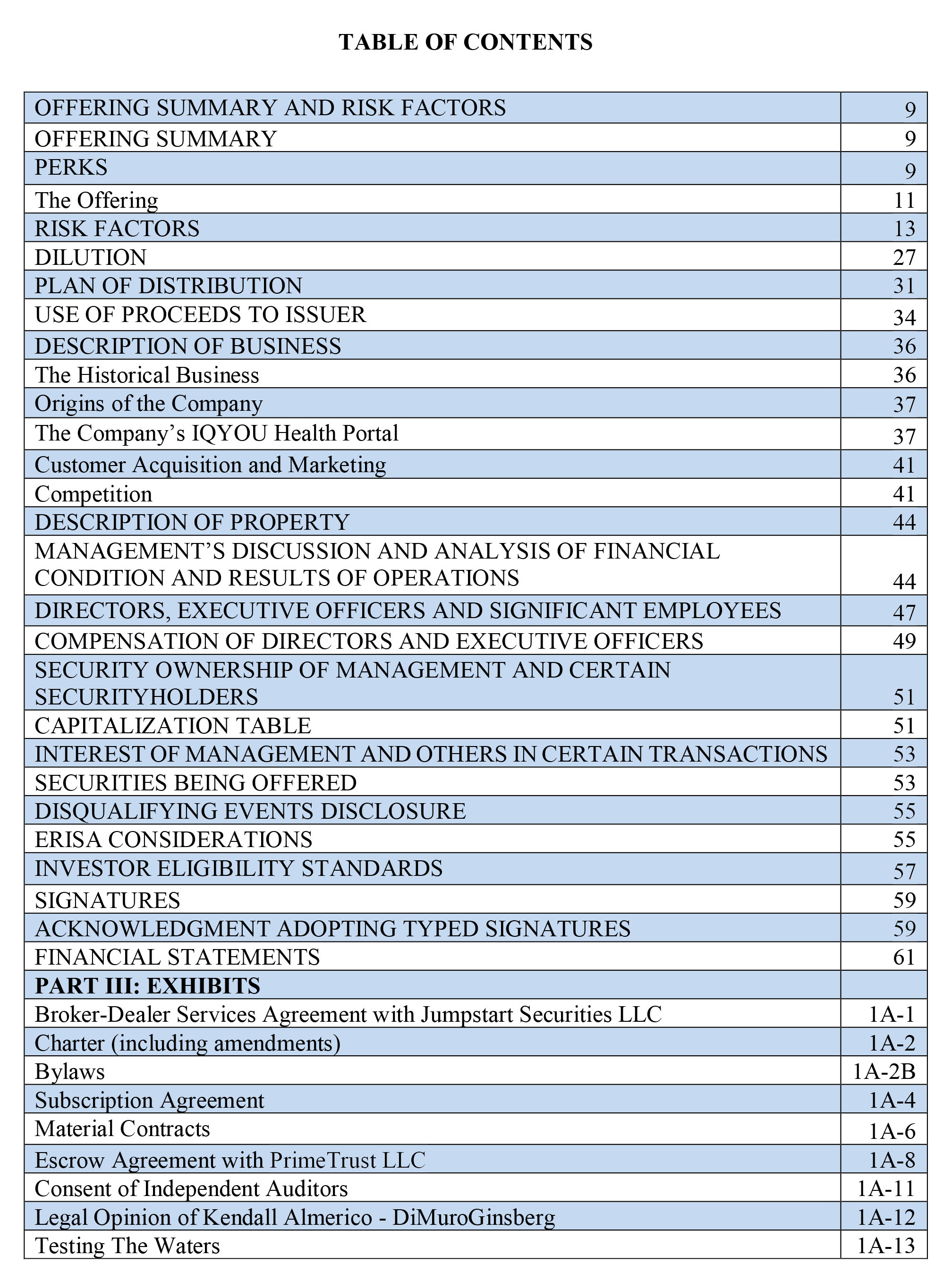 0001703732-17-000005.txt : 20180702 0001703732-17-000005.hdr.sgml : 20180702 20171109172213 ACCESSION NUMBER: 0001703732-17-000005 CONFORMED SUBMISSION TYPE: 1-A/A PUBLIC DOCUMENT COUNT: 41 FILED AS OF DATE: 20171109 DATE AS OF CHANGE: 20180604 FILER: COMPANY DATA: COMPANY CONFORMED NAME: Ithrive PH Inc CENTRAL INDEX KEY: 0001703732 STANDARD INDUSTRIAL CLASSIFICATION: SERVICES-HEALTH SERVICES [8000] IRS NUMBER: 813917776 STATE OF INCORPORATION: DE FISCAL YEAR END: 1231 FILING VALUES: FORM TYPE: 1-A/A SEC ACT: 1933 Act SEC FILE NUMBER: 024-10692 FILM NUMBER: 171191995 BUSINESS ADDRESS: STREET 1: 5415 W CEDAR LANE CITY: BETHESDA STATE: MD ZIP: 20814 BUSINESS PHONE: 6104539079 MAIL ADDRESS: STREET 1: 5415 W CEDAR LANE CITY: BETHESDA STATE: MD ZIP: 20814 1-A/A 1 primary_doc.xml 1-A/A LIVE 0001703732 XXXXXXXX 024-10692 true false false Ithrive PH Inc DE 2016 0001703732 8000 81-3917776 2 3 5415 W. CEDAR LANE BETHESDA MD 20814 6104539079 Kendall Almerico Other 100.00 0.00 0.00 0.00 100.00 14620.00 440900.00 455520.00 -455420.00 100.00 0.00 455520.00 0.00 455520.00 0.00 0.00 IndigoSpire CPA Group, LLC Class A and B Common Stock 28000000 N/A N/A Preferred 0 0 true true true Tier2 Audited Equity (common or preferred stock) Y N N Y N N 8333333 10328788 3.0000 25000000.00 0.00 0.00 0.00 25000000.00 Jumpstart Securities LLC 1250000.00 DiMuroGinsberg PC 75000.00 156214 11400000.00 false true AL AK AZ AR CA CO CT DE DC FL GA HI ID IL IN IA KS KY LA ME MD MA MI MN MS MO MT NE NV NH NJ NM NY NC ND OH OK OR PA PR RI SC SD TN TX UT VT VA WA WV WI WY A0 A1 A2 A3 A4 A5 A6 A7 A8 A9 B0 Z4 AL AK AZ AR CA CO CT DE DC FL GA HI ID IL IN IA KS KY LA ME MD MA MI MN MS MO MT NE NV NH NJ NM NY NC ND OH OK OR PA PR RI SC SD TN TX UT VT VA WA WV WI WY A0 A1 A2 A3 A4 A5 A6 A7 A8 A9 B0 Z4 true GRAPHIC 2 ithriveresponse-003.jpg begin 644 ithriveresponse-003.jpg M_]C_X0 817AI9@ 24DJ @ /_L !%$=6-K>0 ! 0 \ M #_X0.<:'1T<#HO+VYS+F%D;V)E+F-O;2]X87 O,2XP+P \/WAP86-K970@ M8F5G:6X](N^[OR(@:60](EG)E4WI.5&-Z:V,Y9"(_/B \ M>#IX;7!M971A('AM;&YS.G@](F%D;V)E.FYS.FUE=&$O(B!X.GAM<'1K/2)! M9&]B92!835 @0V]R92 U+C8M8S$T,B W.2XQ-C Y,C0L(#(P,37!E+U)E&UL M;G,Z>&UP/2)H='1P.B\O;G,N861O8F4N8V]M+WAA<"\Q+C O(B!X;6QN&UP34TZ1&5R:79E9$9R;VT@&UP;65T83X@/#]X<&%C:V5T(&5N9#TB"\T8C0'6'?K_^X #D%D;V)E &3 ?_; (0 !@0$! 4$!@4%!@D& M!08)"P@&!@@+# H*"PH*#! ,# P,# P0# X/$ \.#!,3%!03$QP;&QL<'Q\? M'Q\?'Q\?'P$'!P<-# T8$! 8&A41%1H?'Q\?'Q\?'Q\?'Q\?'Q\?'Q\?'Q\? M'Q\?'Q\?'Q\?'Q\?'Q\?'Q\?'Q\?'Q\?'Q\?_\ $0@ E@,4 P$1 (1 0,1 M ?_$ '\ 0 " P$! 0$ '" 0%!@,! @D! 0 M 0 $# P,"! 0$! 4# @< $ @,1! 42!@ ;^(0:KA[>N1W7A(\A>/:_WH_<;I! 'K+?$N02$@(" @(-1FMSX MO$MI<2M]PCHS4 ?U0:# ;ERF3RX8'AULZIH.P'YH.V0$! 0$! 0$! 0$! 0$ M! 0$! 0$! 0$! 0$! 0$! 0$! 0$! 0$! 0$! 0$!!^'S0LZ/D:T_P"X@?Q0 M?62Q2?L>U_\ TD'^"#](" @(" @(" @(" @(" @(" @(" @(" @(" @(" @( M" @(" @(" @(" @((2^Y;7=;1O[8&E&!H_Y4*#H>"\(W%[7AA!J8HFQG\7.= M5!)B @(!( ))H!W*".N4^5\/M/"3SE^N2A:S2YHU.H?2*H(1VO#N_D[/PYN] MA-EAF./T]JX.>Z0$UU:J-![(+-[=V];XFV:UH!ET@.=Y? (-P@(" @(" @(" M @(" @(!< :$]2@(" @(" @(" @(" @(" @(" @(" @$TZH,=^2L&&C[B-I' M<%P"#]0WMI.:0S,D/DUP/\$'L@(" @(-7N#<%IAK0SSD%W72VH'85J:H*FD H)D^WO*[BR>*?HA!): @\[BXBMXG2RN#6,!))^""%>8>= M;/;MG]+9.#[N<.$,;=)<2.E3Z@:5\D$:\<<<;JWSFXLKO-SYK4N$T%FXN:P& MH<"YFD"E$%HL!MC$X2UCM[.%L88UK10 4%.@ "#;(" @(" @(" @(" @(" M#DM];V@V_8SO#VM?%&Z21Q(Z -)H*GOT05M=]R^6NQ0$! 0$! 0$! 0$'C=WEO:1&6=X8T>9H@BCD#G'$8*QN6.F MC9)I(8QKFF4DF@%"Y!6^ZYQY+R^1?_9V'Z=SCH880YU*^?J02'PYRON*^S[\ M?E9"V]C;J#-(:#3H[H:(+264YGM(ICWD:''\4'L@("#QO+R&TMWSS.#6,%>J M"M/-^ZLAEKNUQF/N=+Y)29FL=2D5*4-*_P"I!!?_ (];9'?MCCK%A<7S,%T[ MJ:N!JX]*^(07KV+@X,9B6ED?MND#>@%/2&BB#I4! 0$!!^)9HHA61X8/,FB! M%/#,*Q/#QY@U0?M 0$!!B96_98V4EPXCT T!\T%/.;.=,^>XN78^21A?[VIS7-F<75T.%?#4VJ#KD'Q[VL:7/(:T=R4$(\V,V]X9[VY>'S&CHGBC=-#V;^*"]&T9GS[>LY7FKG-ZD_-!N$! 0 M$! 0$! 0$$,[UY*S6!R+)KAKVV(F,M('P:ZB"I^005GY7YO=E99\!M>5]UEYW& MWC$%:1N) []D'WA?A3+3WDN9W1$;BZEJ"R]CC;.QB;';Q M-9I %0.IH@RD! 0$! 0$! 0$! 0$!!X7UW':6LEQ(:-8*H*T\BOR>Z-W,QUL MQ\EB[3]2\5TCU%KFG_BY!A\C8K;N#Q-G;6MA&RXDN(V-T@5J7 G^""9H>XTT@]0@S+6Z@NH&S0N#XW=00@]4 M'YDD;'&Z1YHU@+G$^000%SMS?;[=++&S>7WDK'^U$TGL':=;J>""$]H;WY&S M679=S2S"Q:\%QZAG4^907$X_OY+K$N;([48RVA^#F_'Y(.G0>%U?6EHS7<2M MB;_N-$$4;JY\VSC;Z2Q9?Q-FC<6F-IJ[H2.M.W9!UFQ=_6>X;9CF2"3W"1'( M/&AI1!V2 @(" @U.?W)CL/:R2SRL#XP7%I/8#Q*"K7*W.EWFKS^U;6DDN[J6 MC#+ '$-) %&]/B@V/&G %Q?QPY+<,3KN].,U%E^8+V:S8#;M;+I>!_+V_B@N;B/_ -9; M?_;"#+0$ D $GH!W*"!^>N4+'"VLT++FERYFFUB:>I-15W\4%81E\@]OO,F? M=9G).TL8VI(#JFGYN06"X$XCR./8S)9:#5=W+Q*][A4L!ZTKYH+)M:UK0UHH M!T "#Z@^/>QC=3W!K1W)- @YO<&_<#B()));F,",>IY< T?B4'-X#FG;N8NG M0VEW#YTFLL>>M"-#:_J4$W[BW/C\-:R232M#V M-+G G]H )J?R05USGW'8ZYS4=G8RR7+Y)@PO82& =>H06&V5?RW^WX+F0DN< M3W[T0;FXN(;>)TLS@QC>Y)H@@;F3F7$VD5WB[6X#\AH++6V94N+GB@)I\4'' M\0\+/O8O[YGK9LMV\:Y/> (9ZR 37S: @[#=EKCKB>#$PF-T4+B!_%!RV7Y/VIBIFQ7=W'&75T%[VLK3RJ@ MZ'%Y:SR5N)[5X'(.:DPVUF?3Q]6RWQ<\%HZ_LH0 @D M7BK[>\1A9V96\>^YOG4DDN)VL+]?4G22*CJ>]4$XVEI!:0MAA:&L;\NOY(/; ML@T.1WAC;*]^E<0YX-'&OB.Z#=PS,FB9*PU:\5!^:#]H"#"ES&/BN1;OE D/ M2E0@S4! 0$! 0$! 01?S/R#%MS"7'8A@[5(U/I4-Z((VXOW%C+W;\F8NYHS> M32R/>PEH(%=0[FO9!HVP9O?6]K>1P#,+8R:@/5J>YO[>CB6H+/[7Q3<;B8H M*.(#G?#IV0;9!C9*];964MRX5$8K3XH*L[QY#R>?Y!LL!B)2T1RZ[N9KG4H6 MCT]"/-!939MM-;X"W;*2YQ&JI[]?F@W:#E.0MV6>!P-[-,X-#(7/>ZM*-""J M>(VB[E_>%SEIY9(\9:.;!%&!4N#GOD ]784(J@DWQQ%C!%#_ %V1 MAS&,83I!KJT@5[()EV':,@Q3WM[R/%?#]K13^*#I'.#6EQZ (*]\T\EY,9"# M#XG2+R?HQU7#2T4=4:?$AI01/NKBNRV[MZ3<^8R4MWE+E[2^.@_?-ZCI<2YW M0E!+OVW8^Z.%M+MY>6OEE> ZO1K9"P?^VJ"P" @("#0;MW9:;?LS-,Y@Z$DO M=I ""H^Y^4-U\C;CFP.'_[>PNI3$^[:7EV@]SW IT[()>XI^W;"82!MY='Z MBX<=7O2QLU ZOY002W\T$X6]K:X^U+86!D<;:F@ [#X(*T_Y]\8W!P2/B").8K??#<+'D\C>^S;3BK;6)[P*$]CZJ?H@Y[A+/XO!7=U>Y EQ<0(P-/ M6C36I/S022_:VY>3KSWKRXDL<,QQ=%;PZB7M-::JD#M\$'/\S8C:&U<#98:R ML8W7TCB?J-+ _2!2ITMJ>I0=WQG!;;$V##F)J:S$V=]>G62-J#GG;JWCRG=7 M%C8N_M^+?5K[S5(YY ])!J6CLY!%VVMH,MN4;?#"8SB&5Y<\@5/ML)K5!?'9 MEM]-@((P*#J0/@@X_FC>IP&WKF6-H<;^]SC< M^7>XPRS:_:[MJ'>D#4#Z4%@]Y\@8;9FWW6T1;J>-)H0'/(%0&@?-!Q>P<1G- MR9N+-WKC##40"A9$7./1OI9U(%*(*N\=3/WIRI>9ES3[49Z#O34'M;W^2"ZV+MF M6>-@A!HUC 37IU(J4&BW1OW%X.)[GO8= JYSG4:$%3^5_N&S>;DFQV&UQ