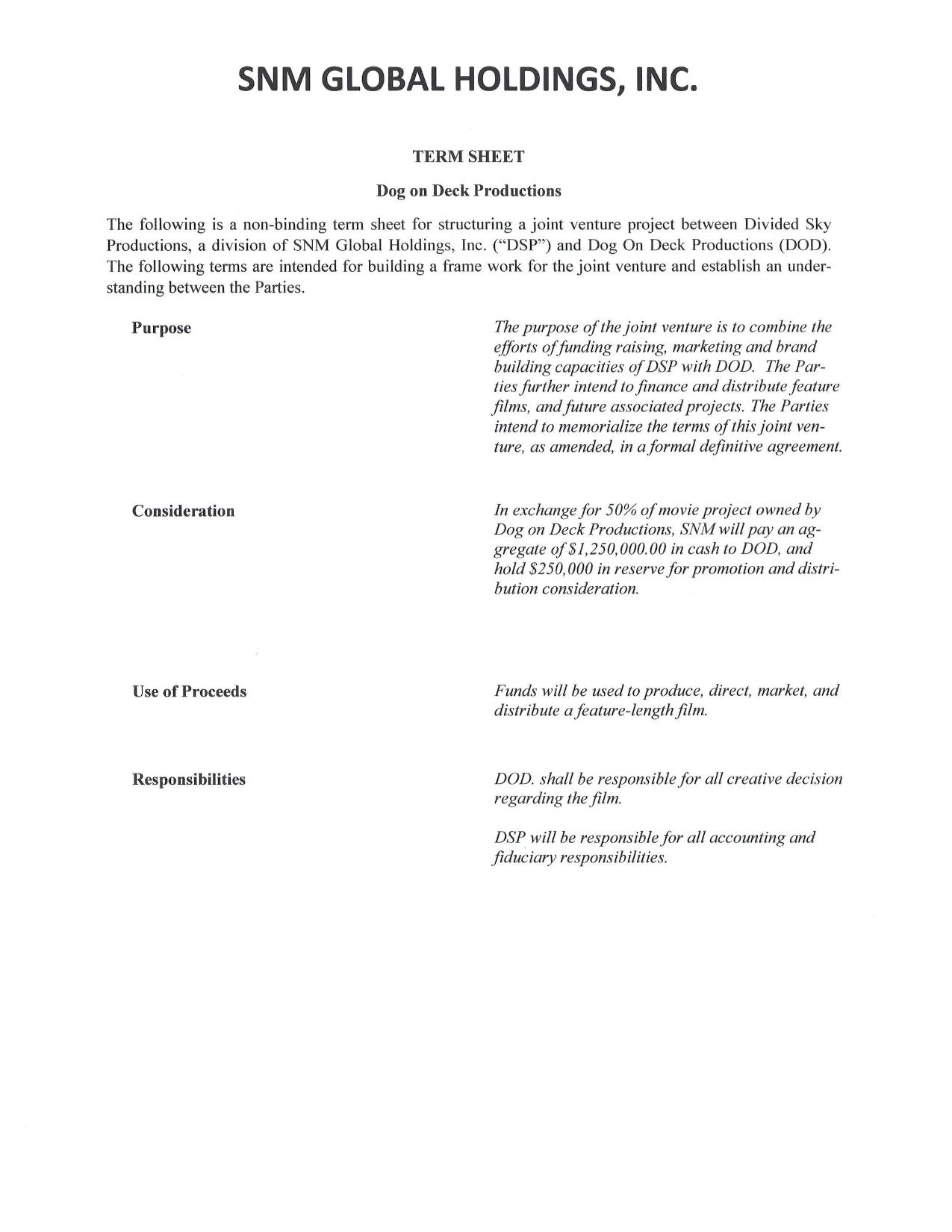 0000721748-17-000372.txt : 20170524 0000721748-17-000372.hdr.sgml : 20170524 20170524161728 ACCESSION NUMBER: 0000721748-17-000372 CONFORMED SUBMISSION TYPE: 1-A PUBLIC DOCUMENT COUNT: 66 FILED AS OF DATE: 20170524 FILER: COMPANY DATA: COMPANY CONFORMED NAME: SNM Global Holdings CENTRAL INDEX KEY: 0001706907 IRS NUMBER: 812153803 STATE OF INCORPORATION: NV FISCAL YEAR END: 1231 FILING VALUES: FORM TYPE: 1-A SEC ACT: 1933 Act SEC FILE NUMBER: 024-10701 FILM NUMBER: 17866873 BUSINESS ADDRESS: STREET 1: 7950 NW 53RD STREET STREET 2: SUITE 337 CITY: MIAMI STATE: FL ZIP: 33166 BUSINESS PHONE: 4107336551 MAIL ADDRESS: STREET 1: 7950 NW 53RD STREET STREET 2: SUITE 337 CITY: MIAMI STATE: FL ZIP: 33166 1-A 1 primary_doc.xml 1-A LIVE 0001706907 XXXXXXXX SNM Global Holdings, Inc. NV 2006 0001706907 7990 81-2153893 5 0 7950 NW 53rd Street, Suite 337 Miami FL 33166 410-733-6551 John E. Lux, Esq. Other 0.00 0.00 0.00 0.00 0.00 455823.00 0.00 455823.00 -455823.00 0.00 0.00 70000.00 0.00 -70000.00 0.00 0.00 Common Stock 1094211721 78461L 20 OTCMarkets, Pink Open Market Series A Preferred Stock 10000000 00000None None None 0 00000None None true true true Tier1 Unaudited Equity (common or preferred stock) Y N Y Y N N 1000000000 1094211711 0.0100 10000000.00 1215000.00 0.00 0.00 11215000.00 John E. Lux, Esq. 17000.00 9600000.00 true FL IL MD MA NY TX SNM Global Holdings Simple Agreement for Equity 405000 0 405000 convertible notes Securities Act of 1933, Section 4(2), sales to persons related to company officers and directors PART II AND III 2 snmglobal.htm