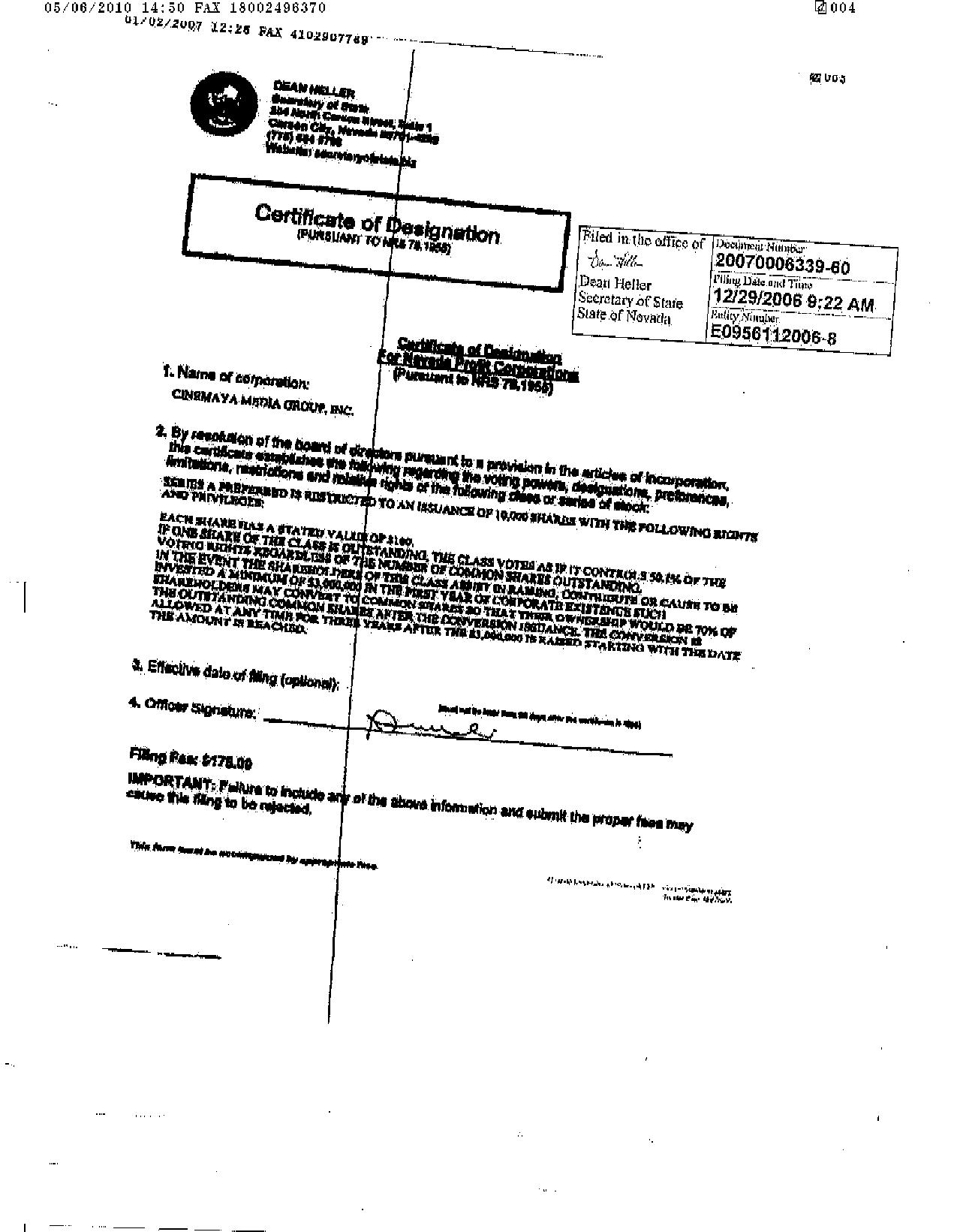 Section 4. RECEIPT OF NOTICES BY THE CORPORATION. Notices, shareholder writings consenting to action, and other documents or writings shall be deemed to have been received by the corporation when they are actually received: (1) at the registered office of the corporation in Nevada; (2) at the principal office of the corporation (as that office is designated in the most recent document filed by the corporation with the secretary of state for Nevada designating a principal office) addressed to the attention of the secretary of the corporation; (3) by the secretary of the corporation wherever the secretary may be found; or (4) by any other person authorized from time to time by the board of directors or the president to receive such writings, wherever such person is found.