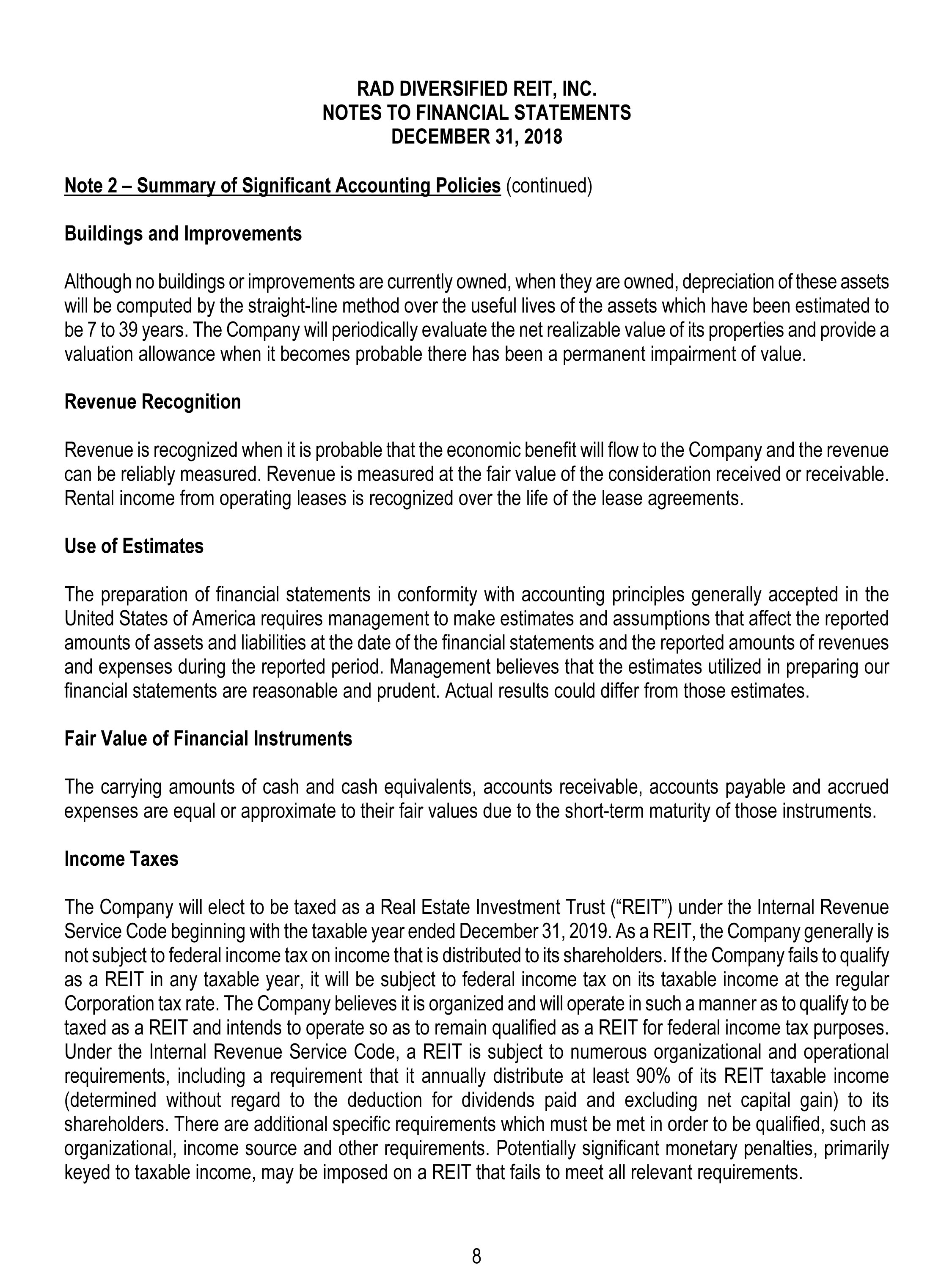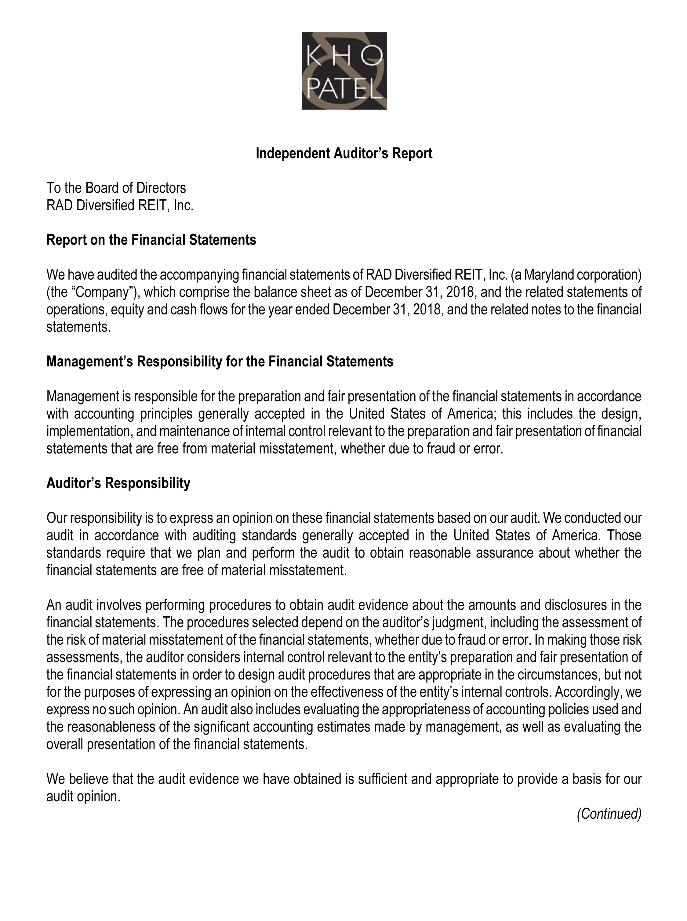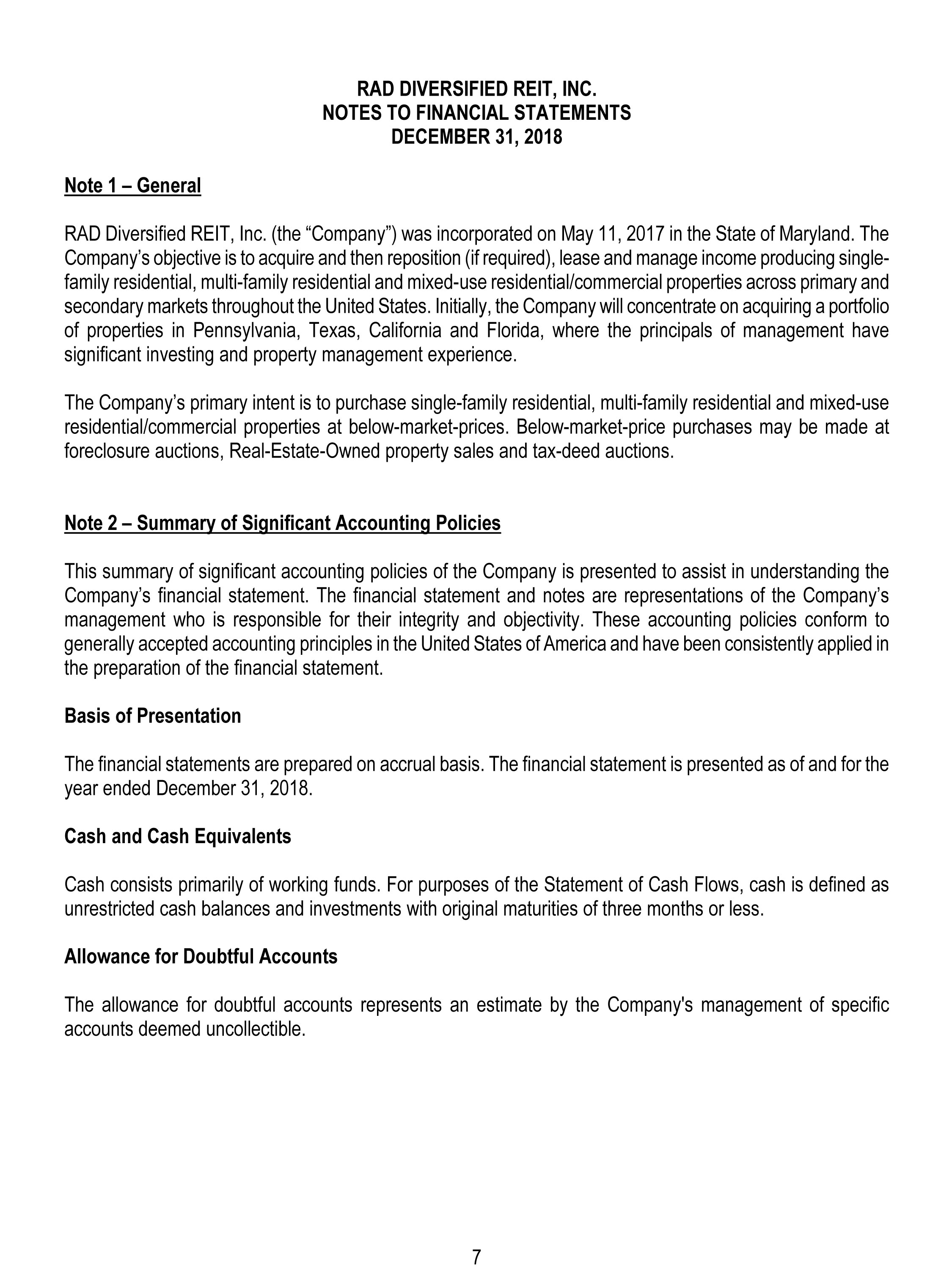 RAD Diversified REIT, Inc., a Maryland corporation referred to herein as our Company, was formed to acquire, reposition, renovate, lease and manage income-producing single-family residential, multi-family residential, and mixed use residential-commercial properties in select markets in the United States, with a focus on acquisition of properties at discounts to fair market value or expected fair value.