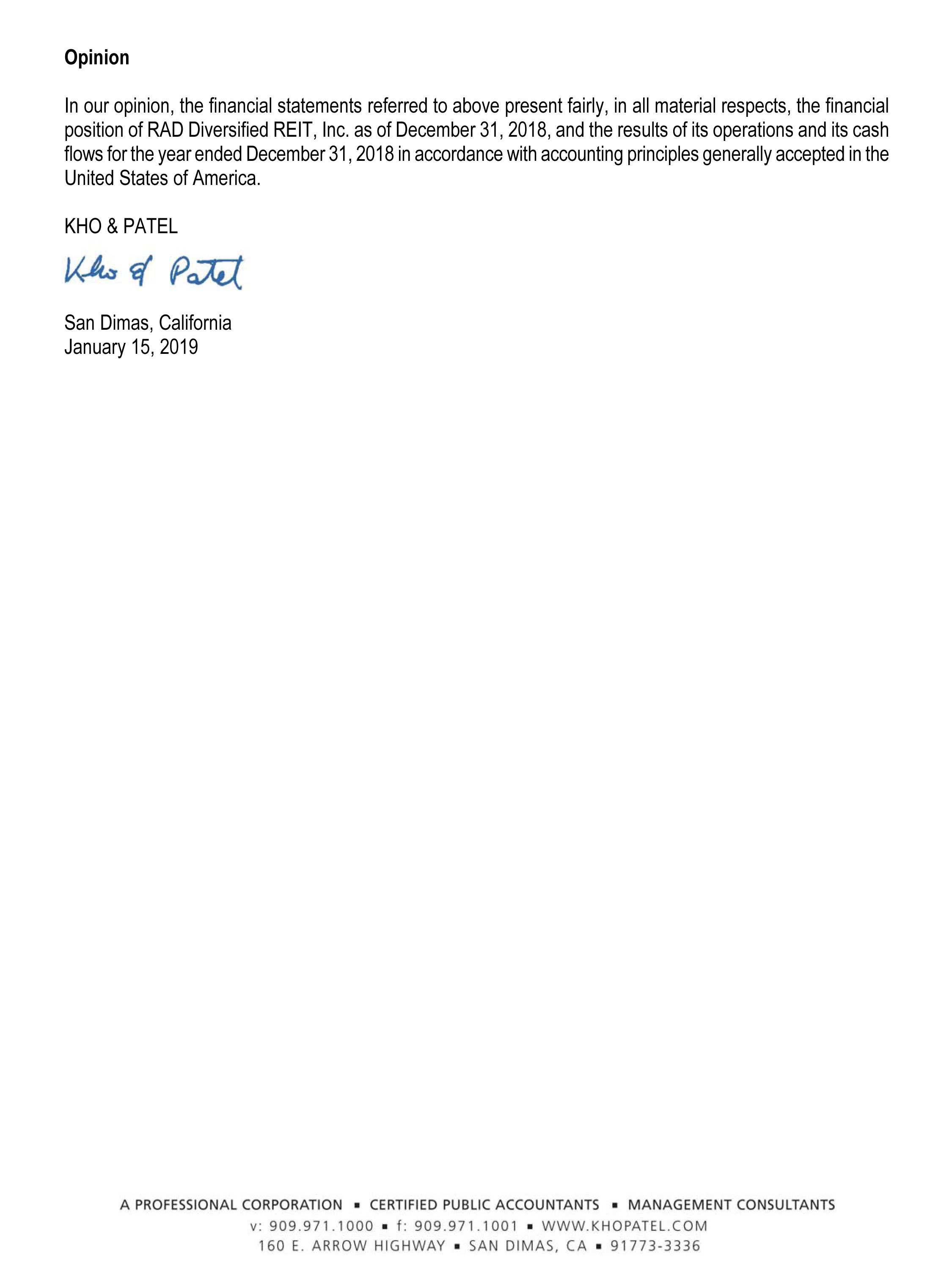 0001721469-19-000016.txt : 20190924 0001721469-19-000016.hdr.sgml : 20190924 20190924171955 ACCESSION NUMBER: 0001721469-19-000016 CONFORMED SUBMISSION TYPE: 1-A/A PUBLIC DOCUMENT COUNT: 45 FILED AS OF DATE: 20190924 DATE AS OF CHANGE: 20190924 FILER: COMPANY DATA: COMPANY CONFORMED NAME: RAD Diversified REIT, Inc. CENTRAL INDEX KEY: 0001721469 STANDARD INDUSTRIAL CLASSIFICATION: REAL ESTATE INVESTMENT TRUSTS [6798] IRS NUMBER: 822026337 STATE OF INCORPORATION: MD FISCAL YEAR END: 1231 FILING VALUES: FORM TYPE: 1-A/A SEC ACT: 1933 Act SEC FILE NUMBER: 024-11020 FILM NUMBER: 191111515 BUSINESS ADDRESS: STREET 1: 4115 WEST SPRUCE STREET CITY: TAMPA STATE: FL ZIP: 91730 BUSINESS PHONE: 855-909-9294 MAIL ADDRESS: STREET 1: 4115 WEST SPRUCE STREET CITY: TAMPA STATE: FL ZIP: 91730 1-A/A 1 primary_doc.xml 1-A/A LIVE 0001721469 XXXXXXXX 024-11020 true false true RAD Diversified REIT, Inc. MD 2017 0001721469 6798 82-2026337 0 0 1306 MONTE VISTA AVE., NO. 5 UPLAND CA 91786 909-437-8390 Jack Jmaev - Attry for issuer Other 998.00 0.00 0.00 0.00 998.00 0.00 0.00 0.00 998.00 998.00 0.00 2.00 0.00 -2.00 0.00 0.00 Kho & Patel COMMON 100 0 0 0 0 true true false Tier2 Audited Equity (common or preferred stock) Y Y N Y N N 5000000 100 10.0000 50000000.00 0.00 0.00 0.00 50000000.00 Kho & Patel 7000.00 RAD Management, LLC 585000.00 49080000.00 true false AL AK AZ AR CA CO CT DE DC FL GA HI ID IL IN IA KS KY LA ME MD MA MI MN MS MO MT NE NV NH NJ NM NY NC ND OH OK OR PA PR RI SC SD TN TX UT VT VA WA WV WI WY A0 A1 A2 A3 A4 A5 A6 A7 A8 A9 B0 Z4 false RAD DIVERSIFIED REIT, INC. COMMON STOCK 100 0 $10 PER SHARE x 100 SHARES = $1,000 1933 ACT, SECT. 4(a)(2) - Sold 100 shares to promoter at formation. PART II AND III 2 rega20190924_01a-amnd2.htm PART II AND III