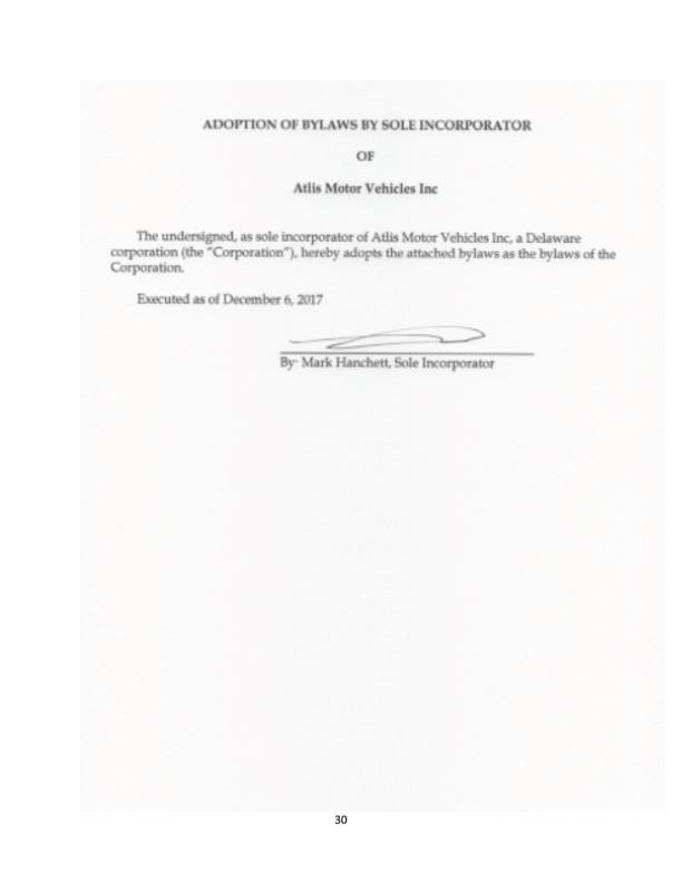 Dear Mark, Atlis Motor Vehicles is pleased to offer you the Full-Time position of CEO starting salary offered for this position is $200,000.00 per year, paid on the 15th and last day of each month. If either the 15th or last day of the month falls on a weekend or holiday, Atlis Motor Vehicles will pay out payroll on the earliest day preceding the intended date which payroll distributes. Direct deposit is available. Your start date with Atlis Motor Vehicles is on November 9, 2016. You will be granted 10,000,000 shares of common stock shares on your date of hire, November16, 2016. Atlis Motor Vehicles offers unlimited paid vacation and sick leave. Prior to taking paid vacation and sick leave, please coordinate with your direct manager or supervisor to ensure that all relevant tasks and deliverables are appropriately re-assigned or completed prior to departure for your time off. Please note that your employment with the Company is for no specified period and constitutes “at will” employment. As a result, you are free to resign at any time, for any reason or for no reason. Similarly, the Company is free to terminate its employment relationship with you at any time, with or without cause. On your first day of employment, you will be provided with additional information about the objectives and policies, benefit programs, and general employment conditions. To fulfill federal identification requirements, you should bring documentation to support your identity and eligibility to work in the United States. We are pleased to have you join the Atlis Motor Vehicles team! We look forward to working with you in the future and hope you will find your employment at Atlis Motor Vehicles a rewarding experience. ___________________________ Mark Hanchett FRIDAY, DECEMBER 20, 2019 Dear Tamica, Atlis Motor Vehicles is pleased to offer you the Full-Time position of VP of Talent. The starting salary offered for this position is $120,000.00 per year, paid on the 15th and last day of each month. If either the 15th or last day of the month falls on a weekend or holiday, Atlis Motor Vehicles will pay out payroll on the earliest day preceding the intended date which payroll distributes. Direct deposit is available. Atlis Motor Vehicles is pleased to also offer the following stock compensation: Your start date with Atlis Motor Vehicles is on March 16, 2020 . This offer will expire at 5:00pm on December 24, 2019. Atlis Motor Vehicles offers unlimited paid vacation and sick leave. Prior to taking paid vacation and sick leave, please coordinate with your direct manager or supervisor to ensure that all relevant tasks and deliverables are appropriately re-assigned or completed prior to departure for your time off. Atlis Motor Vehicles offers health insurance through Blue Cross Blue Shield Arizona. Atlis Motor Vehicles does not currently have a retirement plan. Atlis Motor Vehicles is expected to begin offering retirement plans in 2020. Please note that your employment with the Company is for no specified period, and constitutes “at will” employment. As a result, you are free to resign at any time, for any reason or for no reason. Similarly, the Company is free to terminate its employment relationship with you at any time, with or without cause. On your first day of employment, you will be provided with additional information about the objectives and policies, benefit programs, and general employment conditions. To fulfill federal identification requirements, you should bring documentation to support your identity and eligibility to work in the United States. 30,000 common stock shares Stock shares will be vested over a period of 3 years March 16, 2021 - 10,000 shares issued March 16, 2022 - 10,000 shares issued March 16, 2023 - 10,000 shares issued We are pleased to have you join the Atlis Motor Vehicles team! If you have any questions, please do not hesitate to contact us at annie@atlismotorvehicles.com . We look forward to working with you in the future, and hope you will find your employment at Atlis Motor Vehicles a rewarding experience. Offer Letter Acceptance I have read and accept this offer of employment: Tamica Sears 12/20/2019 Date Requested: Dec 19, 2019, 4:31 PM MST (Dec 19, 2019, 11:31 PM UTC) Annie Pratt (annie@atlismotorvehicles.com) 98.165.208.75 Signed: Dec 20, 2019, 10:23 AM MST (Dec 20, 2019, 5:23 PM UTC) Tamica Sears (tamicasears@gmail.com) 2600:8800:1b00:95c:9dec:e8dd:e550:754 Tamica Sears Offer.pdf Document ID: 6a8e87b4-234d-11ea-9837-bc764e1044f2 Dear Annie, Atlis Motor Vehicles is pleased to offer you the Full-Time position of Chief of Staff starting salary offered for this position is $105,000.00 per year, paid on the 15th and last day of each month. If either the 15th or last day of the month falls on a weekend or holiday, Atlis Motor Vehicles will pay out payroll on the earliest day preceding the intended date which payroll distributes. Direct deposit is available. Your start date with Atlis Motor Vehicles is on December 29, 2019. Stock Compensation: • 1,075,674 shares issued January 1, 2020 • 48,488 shares issued monthly for the next 34 months Atlis Motor Vehicles offers unlimited paid vacation and sick leave. Prior to taking paid vacation and sick leave, please coordinate with your direct manager or supervisor to ensure that all relevant tasks and deliverables are appropriately re-assigned or completed prior to departure for your time off. Atlis Motor Vehicles offers health insurance through Blue Cross Blue Shield Arizona. Atlis Motor Vehicles does not currently have a retirement plan. Atlis Motor Vehicles is expected to begin offering retirement plans in 2020. Please note that your employment with the Company is for no specified period, and constitutes “at will” employment. As a result, you are free to resign at any time, for any reason or for no reason. Similarly, the Company is free to terminate its employment relationship with you at any time, with or without cause. On your
