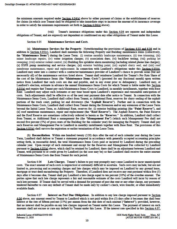 0ADF0948780F2365--FD088BD9--448F1378--88A08D76--0BDB545B889EA087AA37B41F Industrial Lease v6\MH\kh\03450-002 1828 North Higley Road, Suite ___, Mesa, AZ February 12, 2020 [ATLIS MOTOR VEHICLES INC.] 28 Tenant shall also indemnify Landlord against and hold harmless Landlord (and Landlord’s members, managers, partners, and shareholders, as applicable, and the affiliates, employees, agents, and contractors of Landlord and its members, managers, partners, and shareholders, as applicable) from all costs, expenses, demands and liability Landlord may incur if Landlord becomes or is made a party to any claim or action (a) instituted by Tenant against any third party, or by any third party against Tenant, or by or against any person holding any interest under or using the Property by license of or agreement with Tenant (a "Tenant Licensee"); (b) for foreclosure of any lien for labor or material furnished to or for Tenant or such Tenant Licensee; (c) otherwise arising out of or resulting from any act or transaction of Tenant or such Tenant Licensee; or (d) necessary to protect Landlord’s interest under this Lease in a bankruptcy case, or other proceeding under Title 11 of the United States Code, as amended. Tenant shall defend Landlord against any such claim or action at Tenant’s expense with counsel reasonably acceptable to Landlord or, at Landlord’s election, Tenant shall reimburse Landlord for any legal fees or costs Landlord incurs in any such claim or action. Without limitation on other obligations of Tenant that shall survive the expiration or earlier termination of the Lease Term, the obligations of Tenant contained in this Section 12.01 shall survive the expiration or earlier termination of this Lease. Section 12.02 Landlord’s Consent. Tenant shall pay Landlord’s reasonable attorneys’ fees incurred in connection with (a) Tenant’s request for Landlord’s consent under Article Nine (Assignment and Subletting) of this Lease, or in connection with any other act which Tenant proposes to do and which requires Landlord’s consent, or (b) any other Landlord action requested by Tenant. ARTICLE THIRTEEN BROKERS Landlord and Tenant hereby warrant to each other that they have had no dealings with any real estate broker or agent in connection with the negotiation of this Lease, and that they know of no other real estate broker or agent who is entitled to a commission in connection with this Lease, excepting only the real estate broker(s) or agent(s) named in Section 1.09 above (the “Brokers”). Each party agrees to indemnify and defend the other party against and hold the other party harmless from any and all claims, demands, losses, liabilities, lawsuits, judgments, and costs and expenses (including without limitation reasonable attorneys’ fees) with respect to any leasing commission or equivalent compensation alleged to be owing on account of the indemnifying party’s dealings with any real estate broker or agent, other than the Broker(s). ARTICLE FOURTEEN TENANT IMPROVEMENTS Section 14.01 Tenant Improvements. Tenant desires to make certain improvements to the Property, which such improvements shall be mutually agreed to between Landlord and Tenant (collectively, the “Tenant Improvements”). Upon mutual agreement as to the scope of the Tenant Improvements and subject to Landlord’s review and approval of all plans and specifications for the Tenant Improvements, Tenant shall have the right to construct the Tenant Improvements, provided (i) Tenant obtains all necessary permits, approvals and other entitlements required from the City of Mesa, Arizona, including the final approved inspection card for the Tenant Improvements, a copy of which shall be delivered to Landlord; (ii) all contractors are licensed and in good standing by the Department of Consumer Affairs Contractor State License Board, State of Arizona; (iii) Tenant shall allow Landlord’s affiliated company, Commerce Construction Co., L.P., to competitively bid the construction of the Tenant Improvement; (iv) the Tenant Improvements are (a) constructed in good workmanlike manner with first-class materials, and (b) in compliance with all Applicable Laws; (v) Tenant obtains, for Landlord’s benefit and protection, such insurance as Landlord may reasonably require (in addition to that required under Section 4.04 of this Lease) with respect to the construction of the Tenant Improvements; and (vi) Tenant delivers to Landlord executed unconditional mechanic’s lien releases for any contractor or material supplier of the Tenant Improvements which shall comply with the appropriate statutory provisions, as reasonably determined by Landlord (collectively, the “Completion Requirements”). In addition to the foregoing and prior to commencement of construction of the Tenant Improvements, Landlord shall have the right to require that Tenant either: (I) increase the Security Deposit by an amount equal to the cost to complete construction of the Tenant Improvements; or (II) Landlord may require Tenant to provide demolition and/or lien and completion bonds in form and amount satisfactory to Landlord. Upon the completion of Tenant Improvements, the Tenant Improvements shall become Landlord’s property and shall be surrendered to Landlord upon the expiration or earlier termination of the Lease, as amended, in such condition as set forth in this Lease, unless Landlord, in its sole discretion, requires removal of such Tenant Improvements, in which case, such Tenant Improvements shall be removed and any damage caused by the installation or removal of such Tenant Improvements shall be repaired. Notwithstanding the foregoing, Tenant may request at the time it seeks Landlord's consent to the Tenant Improvements that Landlord state at the time it grants approval, whether or not removal of any of the Tenant Improvements will be required at the end of the Lease Term. Such request shall specifically cite this Section and Landlord's obliga