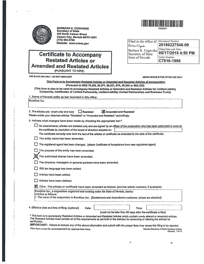 0001144204-18-035345.txt : 20180622 0001144204-18-035345.hdr.sgml : 20180622 20180622153135 ACCESSION NUMBER: 0001144204-18-035345 CONFORMED SUBMISSION TYPE: 1-A PUBLIC DOCUMENT COUNT: 23 FILED AS OF DATE: 20180622 FILER: COMPANY DATA: COMPANY CONFORMED NAME: Rooshine, Inc. CENTRAL INDEX KEY: 0001743277 IRS NUMBER: 465717016 FILING VALUES: FORM TYPE: 1-A SEC ACT: 1933 Act SEC FILE NUMBER: 024-10858 FILM NUMBER: 18914420 BUSINESS ADDRESS: STREET 1: 105 PINE CREEK TRAIL CITY: ORMOND BEACH STATE: FL ZIP: 32174 BUSINESS PHONE: 386-451-9009 MAIL ADDRESS: STREET 1: 105 PINE CREEK TRAIL CITY: ORMOND BEACH STATE: FL ZIP: 32174 1-A 1 primary_doc.xml 1-A LIVE 0001743277 XXXXXXXX Rooshine, Inc. NV 1998 0001743277 5180 46-5717016 0 1 105 PINE CREEK TRAIL ORMOND BEACH FL 32174 386-673-7246 Marc Adesso, Esq. Other 393.00 0.00 33313.00 11670.00 218668.00 305629.00 25444.00 331073.00 -112405.00 218668.00 0.00 0.00 1411.00 -37245.00 0.00 0.00 Common Stock 485317243 776616104 OTC Markets N/A 0 000000N/A N/A N/A 0 000000N/A N/A true true Tier1 Unaudited Equity (common or preferred stock) N N N Y N N 500000000 485317243 0.0100 5000000.00 0.00 0.00 0.00 5000000.00 Waller Lansden Dortch & Davis 30000.00 TBD 20000.00 true FL NY true PART II AND III 2 tv496733_partiiandiii.htm PART II AND III