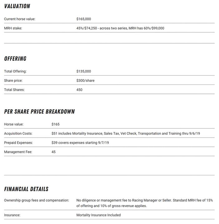 (2) Series The Filly Four is comprised of four (4) horses, (i) a 2018 Filly named, Moonlight d’Oro (formerly Venetian Sonata 18), (ii) a 2018 Filly named, Joyful Addiction (formerly My Sweet Addiction 18), (iii) a 2018 Filly named, Lady Valentine (formerly My Lady Lauren 18), and (iv) a 2018 Filly named, Shared Empire (formerly Sapucai 18).