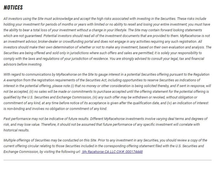 0001683168-20-001793.txt : 20200529 0001683168-20-001793.hdr.sgml : 20200529 20200529171259 ACCESSION NUMBER: 0001683168-20-001793 CONFORMED SUBMISSION TYPE: 1-A POS PUBLIC DOCUMENT COUNT: 85 FILED AS OF DATE: 20200529 DATE AS OF CHANGE: 20200529 FILER: COMPANY DATA: COMPANY CONFORMED NAME: My Racehorse CA LLC CENTRAL INDEX KEY: 0001744448 STANDARD INDUSTRIAL CLASSIFICATION: RETAIL-MISCELLANEOUS RETAIL [5900] IRS NUMBER: 000000000 STATE OF INCORPORATION: NV FISCAL YEAR END: 1231 FILING VALUES: FORM TYPE: 1-A POS SEC ACT: 1933 Act SEC FILE NUMBER: 024-10896 FILM NUMBER: 20929228 BUSINESS ADDRESS: STREET 1: 250 W. FIRST ST., STE. 256 CITY: CLAREMONT STATE: CA ZIP: 91711 BUSINESS PHONE: 909-767-0226 MAIL ADDRESS: STREET 1: 250 W. FIRST ST., STE. 256 CITY: CLAREMONT STATE: CA ZIP: 91711 1-A POS 1 primary_doc.xml 1-A POS LIVE 0001744448 XXXXXXXX 024-10896 My Racehorse CA LLC NV 2016 0001744448 7948 83-0848007 0 0 250 W. FIRST ST., STE. 256 CLAREMONT CA 91711 909-740-9175 Michael Behrens Other 0.00 0.00 484670.00 2990695.00 3511580.00 1724875.00 15606.00 1740481.00 1771099.00 3511580.00 263655.00 502233.00 472260.00 -1288347.00 0.00 0.00 IndigoSpire CPA Group, LLC See Part II for full listing 46766 000000N/A N/A none 0 000000N/A N/A none 0 000000N/A N/A true true Tier2 Audited Other(describe) Series LLC Interests Y Y N Y N N 49755 46766 6630390.00 0.00 0.00 0.00 6630390.00 IndigoSpire CPA Group, LLC 0.00 Procopio, Cory, Hargreaves & Savitch, LLP 0.00 6630390.00 Estimated net proceeds do not reflect offering expenses because such expenses will be paid by the Manager. true AK AZ AR CA CO CT DE FL GA HI ID IL IN IA KS KY LA ME MD MA MI MN MS MO MT NV NH NJ NM NY NC ND OH OK OR PA RI SC SD TN TX UT VT VA WA WV WI WY DC PR A0 A1 A2 A3 A4 A5 A6 A7 A8 A9 B0 Z4 My Racehorse CA LLC See Exhibit 16.1 39640 0 4,799,668.00 Issuer has relied on Rule 147A, promulgated under Section 28 of the Securities Act, for intrastate offerings in California, Rule 506(c) or Regulation A, respectively, for such offerings. PART II AND III 2 myracehorse_1apos11.htm PART II AND III