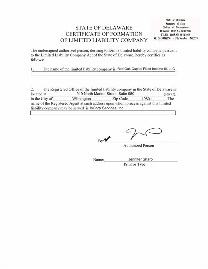 This Limited Liability Company Agreement, dated June 12, 2019, of Red Oak Capital Fixed Income III, LLC, a Delaware limited liability company (the “Company”), is entered into by the Company and Red Oak Capital GP, LLC, a Delaware limited liability company, the sole member of the Company (the “Member”).