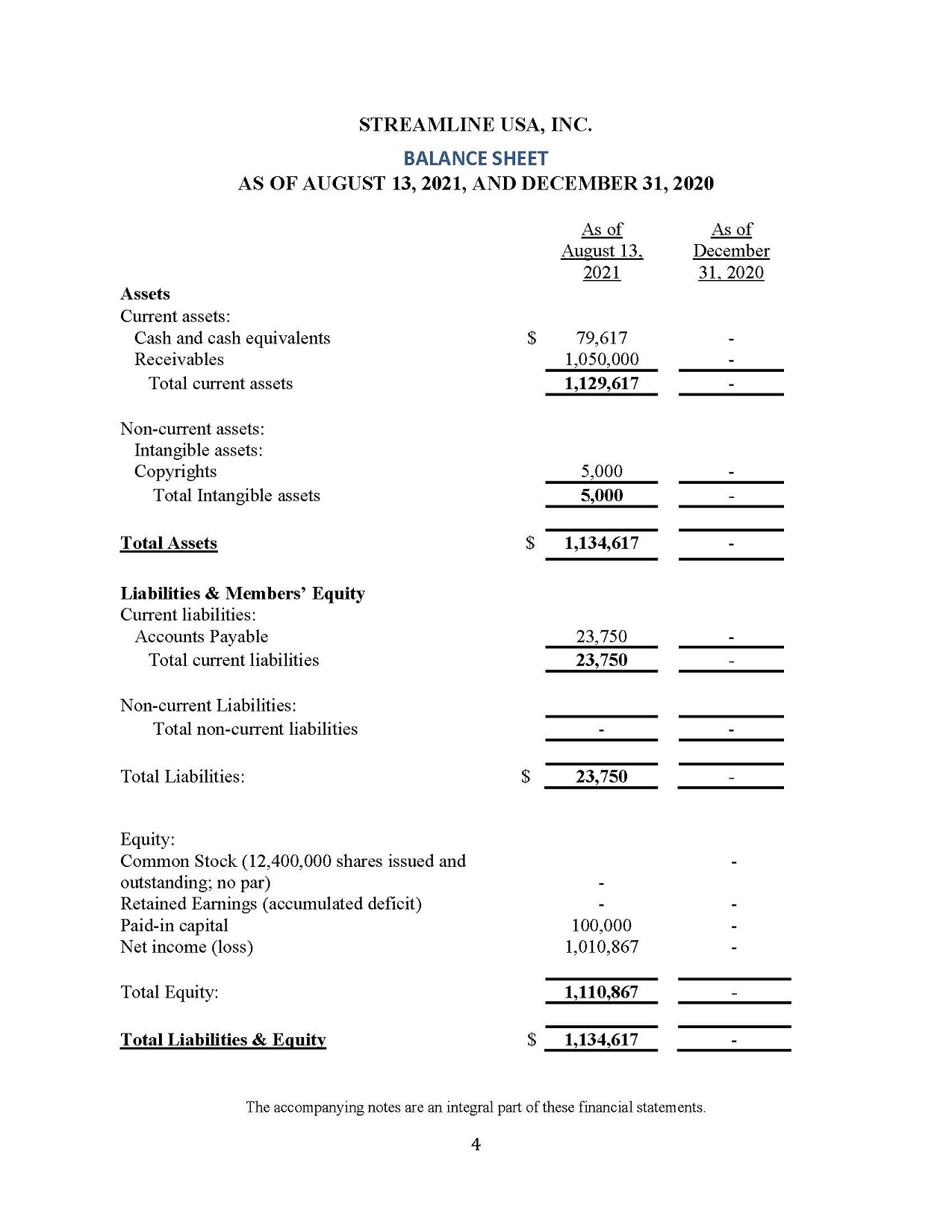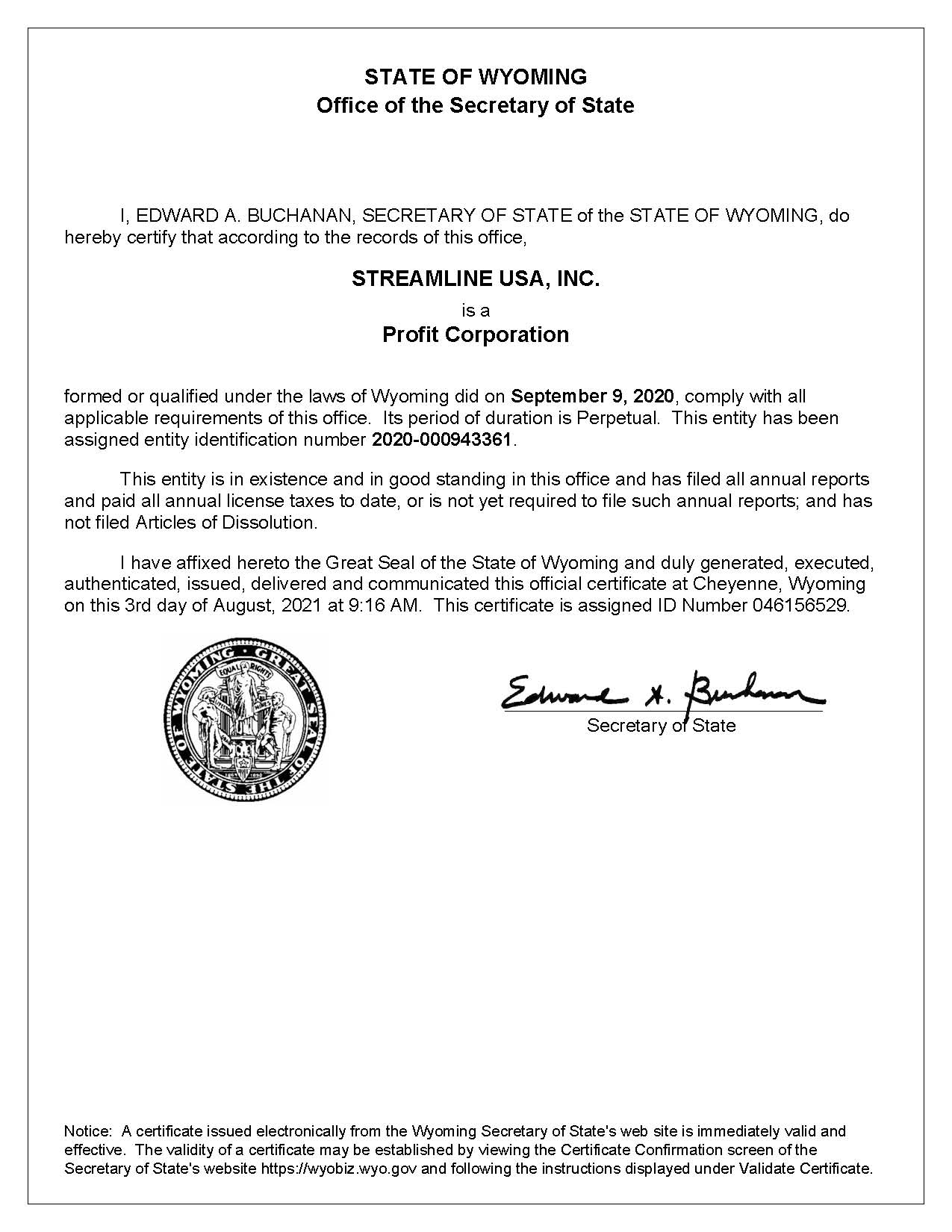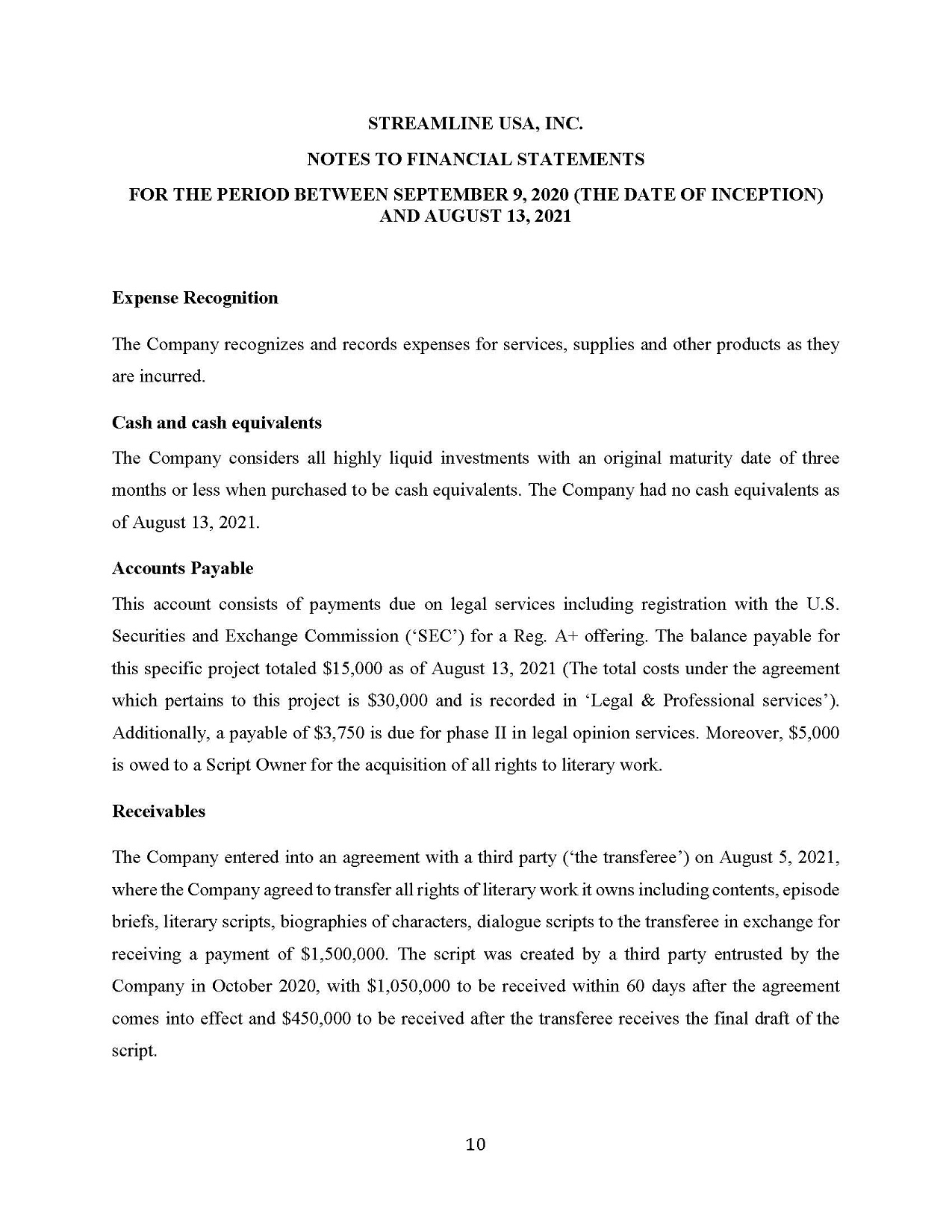 0001877566-21-000007.txt : 20211028 0001877566-21-000007.hdr.sgml : 20211028 20211027173617 ACCESSION NUMBER: 0001877566-21-000007 CONFORMED SUBMISSION TYPE: 1-A/A PUBLIC DOCUMENT COUNT: 43 FILED AS OF DATE: 20211028 DATE AS OF CHANGE: 20211027 FILER: COMPANY DATA: COMPANY CONFORMED NAME: Streamline USA, Inc. CENTRAL INDEX KEY: 0001877566 STANDARD INDUSTRIAL CLASSIFICATION: SERVICES-MOTION PICTURE & VIDEO TAPE PRODUCTION [7812] IRS NUMBER: 871984205 STATE OF INCORPORATION: WY FISCAL YEAR END: 1231 FILING VALUES: FORM TYPE: 1-A/A SEC ACT: 1933 Act SEC FILE NUMBER: 024-11628 FILM NUMBER: 211354110 BUSINESS ADDRESS: STREET 1: 11264 PLAYA CT CITY: CULVER CITY STATE: CA ZIP: 90230 BUSINESS PHONE: 212-618-1205 MAIL ADDRESS: STREET 1: 11264 PLAYA CT CITY: CULVER CITY STATE: CA ZIP: 90230 1-A/A 1 primary_doc.xml 1-A/A LIVE 0001877566 XXXXXXXX 024-11628 false false false Streamline USA, Inc. WY 2020 0001877566 7822 87-1984205 5 0 14 WALL ST 20TH FLOOR NEW YORK NY 10005 7186440106 Vic Devlaeminck, Esquire Other 79617.00 0.00 1050000.00 5000.00 1134617.00 23750.00 0.00 23750.00 1110867.00 1134617.00 1050000.00 39133.00 0.00 1010867.00 0.00 0.00 Lama Najib, CPA common/voting/diluted 0 0 n/a 0 0 0 n/a 0 0 0 n/a true true false Tier2 Audited Equity (common or preferred stock) N Y N N N N 30000000 30000000 2.5000 0.00 0.00 0.00 0.00 0.00 n/a 0.00 n/a 0.00 n/a 0.00 n/a 0.00 n/a 0.00 n/a 0.00 n/a 0.00 75000000.00 true false AL AK AZ AR CA CO CT DE DC FL GA HI ID IL IN IA KS KY LA ME MD MA MI MN MS MO MT NE NV NH NJ NM NY NC ND OH OK OR PA PR RI SC SD TN TX UT VT VA WA WV WI WY A0 A1 A2 A3 A4 A5 A6 A7 A8 A9 B0 Z4 true PART II AND III 2 StreamAmendedOfferingCir.txt OFFERING AMENDMENT PART II . FIRST AMENDED PRELIMINARY OFFERING CIRCULAR Steamline USA, Inc. S.E.C. CIK # 0001877566 / S.E.C. File No.: 024-11628 AN OFFERING STATEMENT PURSUANT TO REGULATION A RELATING TO THESE SECURITIES HAS BEEN FILED WITH THE SECURITIES AND EXCHANGE COMMISSION. INFORMATION CONTAINED IN THIS FIRST AMENDED PRELIMINARY OFFERING CIRCULAR IS SUBJECT TO COMPLETION OR AMENDMENT. THESE SECURITIES MAY NOT BE SOLD NOR MAY OFFERS TO BUY BE ACCEPTED BEFORE THE OFFERING STATEMENT FILED WITH THE COMMISSION IS QUALIFIED. THIS FIRST AMENDED PRELIMINARY OFFERING CIRCULAR SHALL NOT CONSTITUTE AN OFFER TO SELL OR THE SOLICITATION OF AN OFFER TO BUY NOR MAY THERE BE ANY SALES OF THESE SECURITIES IN ANY STATE IN WHICH SUCH OFFER, SOLICITATION OR SALE WOULD BE UNLAWFUL BEFORE REGISTRATION OR QUALIFICATION UNDER THE LAWS OF ANY SUCH STATE. WE MAY ELECT TO SATISFY OUR OBLIGATION TO DELIVER A FINAL OFFERING CIRCULAR BY SENDING YOU A NOTICE WITHIN TWO BUSINESS DAYS AFTER THE COMPLETION OF OUR SALE TO YOU THAT CONTAINS THE URL WHERE THE FINAL OFFERING CIRCULAR OR THE OFFERING STATEMENT IN WHICH SUCH FINAL OFFERING CIRCULAR WAS FILED MAY BE OBTAINED. GENERALLY, NO SALE MAY BE MADE TO YOU IN THIS OFFERING IF THE AGGREGATE PURCHASE PRICE YOU PAY IS MORE THAN 10% OF THE GREATER OF YOUR ANNUAL INCOME OR NET WORTH. DIFFERENT RULES APPLY TO ACCREDITED INVESTORS AND NON-NATURAL PERSONS. BEFORE MAKING ANY REPRESENTATION THAT YOUR INVESTMENT DOES NOT EXCEED APPLICABLE THRESHOLDS, WE ENCOURAGE YOU TO REVIEW RULE 251(d)(2)(i)(C) OF REGULATION A. FOR GENERAL INFORMATION ON INVESTING, WE ENCOURAGE YOU TO REFER TO www.investor.gov. TO THE EXTENT NOT INCONSISTENT WITH THE LEGENDS ABOVE, THIS FIRST AMENDED PRELIMINARY OFFERING CIRCULAR IS BEING UTILIZED, AS THE SOLE DOCUMENT FOR THE PURPOSES OF POST-FILING TESTING THE WATERS, AND SOLELY FOR THE PURPOSES ALLOWED PURSUANT TO SAID RULES. JOBS ACT / REGULATION A+ FIRST AMENDED PRELIMINARY OFFERING CIRCULAR. THE UNITED STATES SECURITIES AND EXCHANGE COMMISSION DOES NOT PASS UPON THE MERITS OF OR GIVE APPROVAL TO ANY SECURITIES OFFERED OR THE TERMS OF THE OFFERING, OR PASS UPON THE ACCURACY OR COMPLETENESS OF ANY PRELIMINARY OFFERING CIRCULARS OR OTHER SELLING LITERATURE. THESE SECURITIES ARE OFFERED PURSUANT TO AN EXEMPTION FROM REGISTRATION WITH THE COMMISSION AND THE COMMISSION HAS NOT MADE AN INDEPENDENT DETERMINATION THAT THE SECURITIES OFFERED HEREUNDER ARE EXEMPT FROM REGISTRATION. FURTHER, THE COMMISSION DOES NOT ENDORSE OFFERINGS. NOTHING IN THE ORIGINAL PRELIMINARY OFFERING CIRCULAR, OR IN THIS FIRST AMENDED PRELIMINARY OFFERING CIRCULAR, THEREFORE, MAY BE TAKEN AS IN ANY WAY, SHAPE, OR FORM, AS AN S.E.C. ENDORSEMENT OF THIS OFFERING. THE MINIMUM FOR THIS OFFERING IS $5,000.00 AND THE MAXIMUM IS $5 MILLION. Issuers Representative: Tony Ramos / Streamline USA, Inc. 14 Wall Street, 20th floor NY, NY, 10005 212-618-1285 tony@streamusa-investors.com Date of Preliminary Offering Circular: August 27,2021 Date of First Amended Preliminary Offering Circular: October 25, 2021 APPROXIMATE DATE OF COMMENCEMENT OF PROPOSED SALES TO THE PUBLIC: upon qualification. DESCRIPTION OF SECURITIES: $75,000,000.00 common/voting/diluted shares / Tier 2 Regulation A UNDERWRITERS: none. DISTRIBUTION SPREAD TABLE Asking price to public $2.50 per share Underwriting discounts and commissions Sellers:none other than the Issuer's representative Proceeds to Issuer or to other persons per unit 100% to Issuing company Termination date Three years after last qualification date Total maximum securities offered 2,000,000 Total minimum securities offered 2,000 TABLE OF CONTENTS ITEM 1 . COVER PAGE...........................................above ITEM 2. TABLE OF CONTENTS.....................................i-iii ITEM 3. SUMMARY AND RISK FACTORS ..............................1-6 ITEM 4. DILUTION...............................................7-8 ITEM 5. PLAN OF DISTRIBUTION AND SELLING SECURITY HOLDERS...................................8-10 ITEM 6. USE OF PROCEEDS TO ISSUER.............................10-12 ITEM 7. DESCRIPTION OF BUSINESS...............................13-19 ITEM 8. DESCRIPTION OF PROPERTY.................................19 ITEM 9. MANAGEMENTS DISCUSSION AND ANALYSIS OF FINANCIAL CONDITION AND RESULTS OF OPERATIONS........................