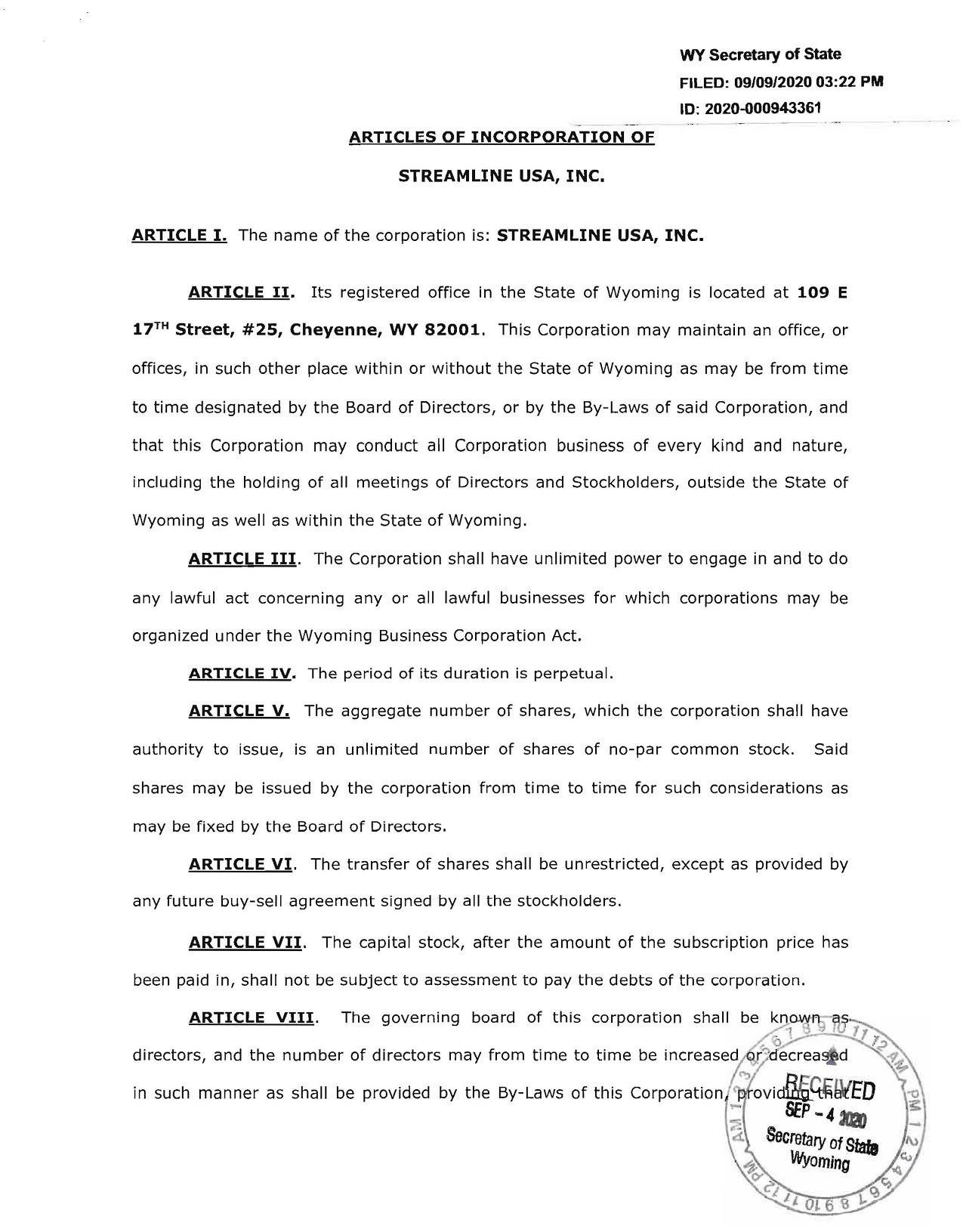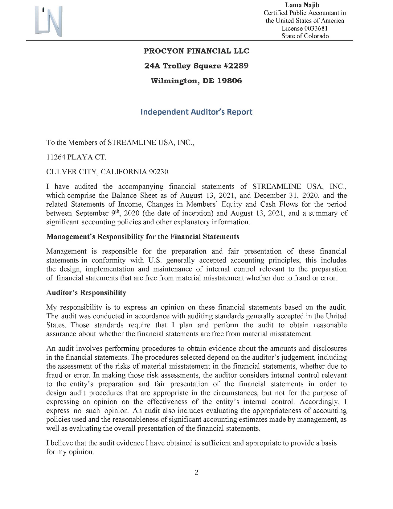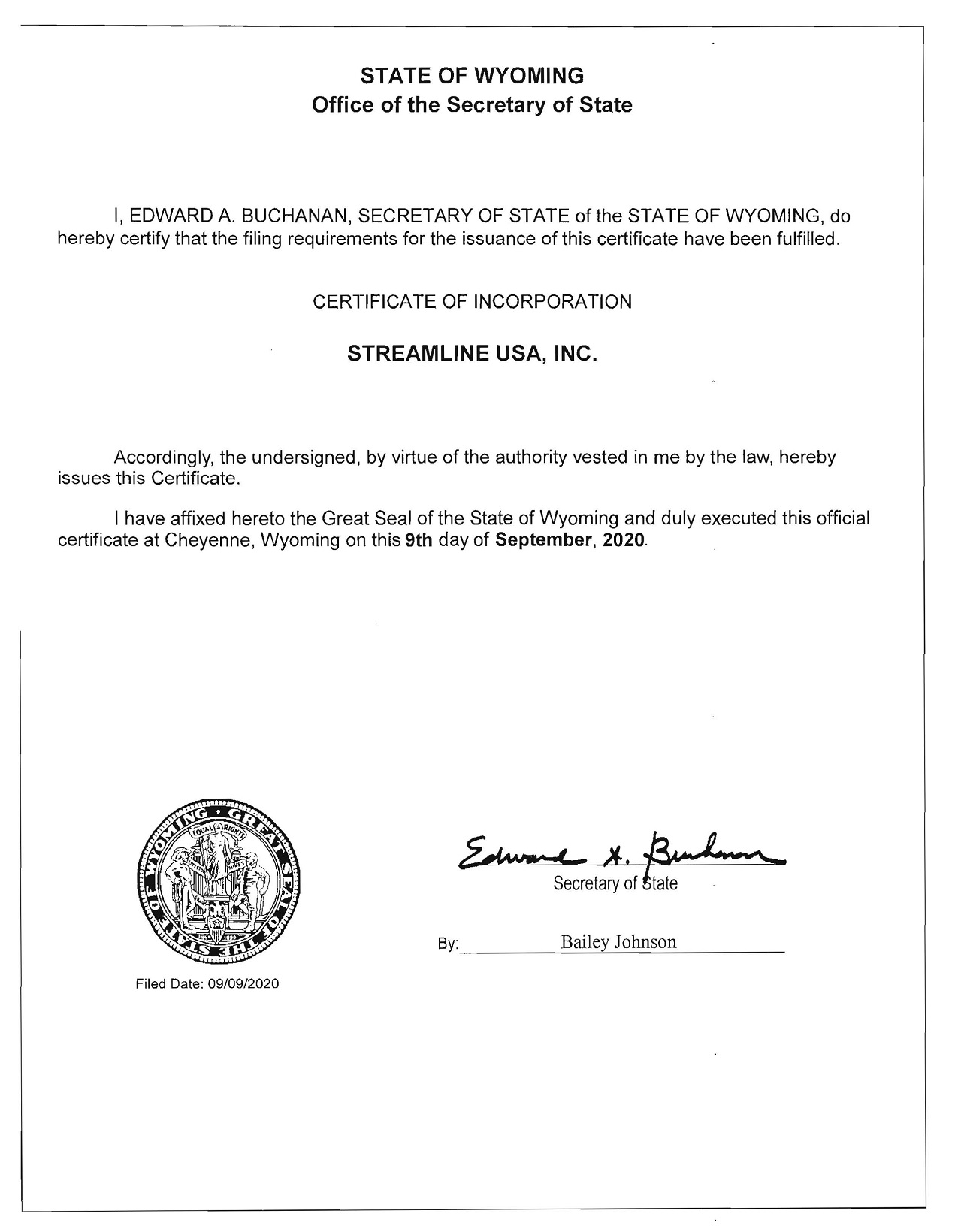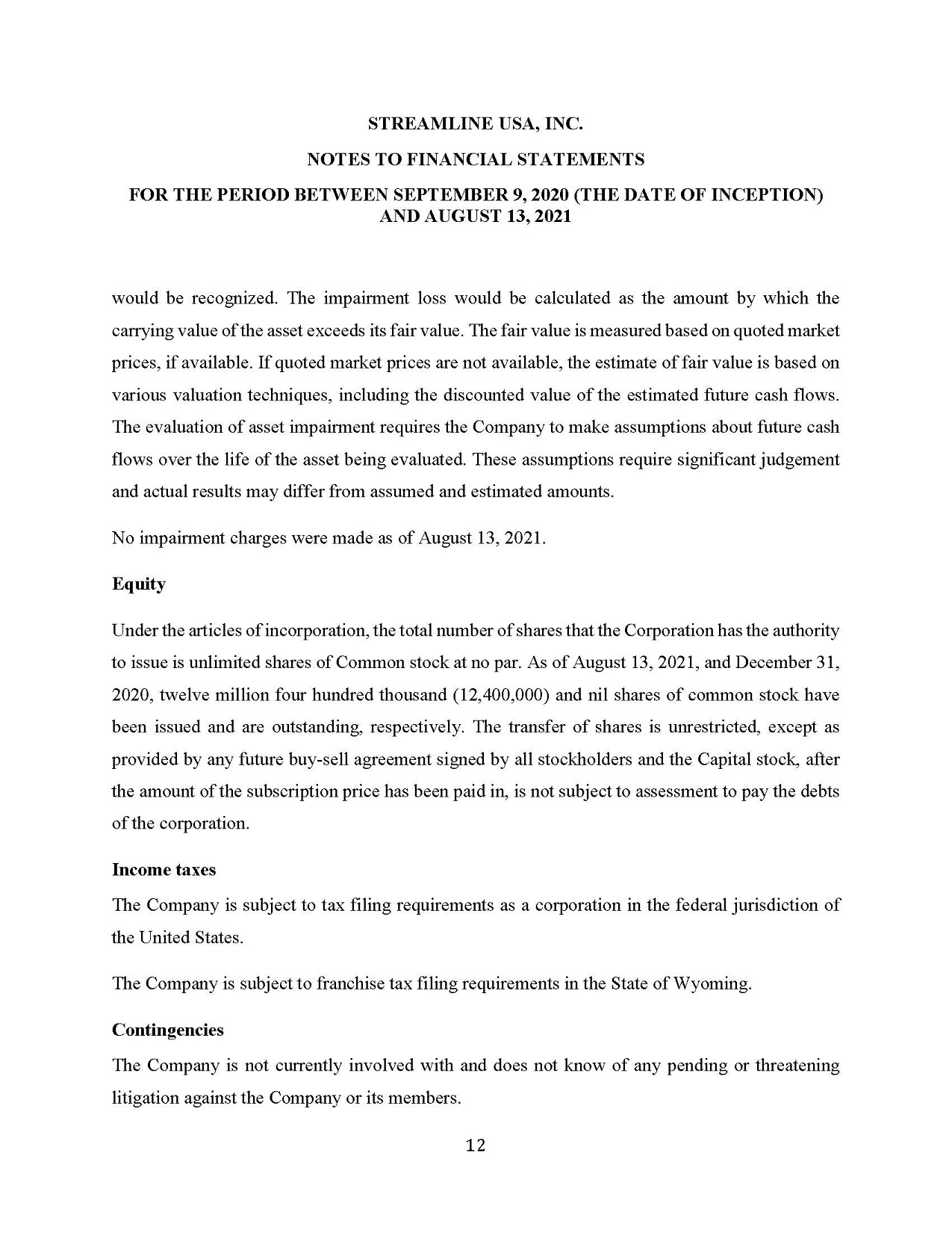 0001877566-21-000007.txt : 20211028 0001877566-21-000007.hdr.sgml : 20211028 20211027173617 ACCESSION NUMBER: 0001877566-21-000007 CONFORMED SUBMISSION TYPE: 1-A/A PUBLIC DOCUMENT COUNT: 43 FILED AS OF DATE: 20211028 DATE AS OF CHANGE: 20211027 FILER: COMPANY DATA: COMPANY CONFORMED NAME: Streamline USA, Inc. CENTRAL INDEX KEY: 0001877566 STANDARD INDUSTRIAL CLASSIFICATION: SERVICES-MOTION PICTURE & VIDEO TAPE PRODUCTION [7812] IRS NUMBER: 871984205 STATE OF INCORPORATION: WY FISCAL YEAR END: 1231 FILING VALUES: FORM TYPE: 1-A/A SEC ACT: 1933 Act SEC FILE NUMBER: 024-11628 FILM NUMBER: 211354110 BUSINESS ADDRESS: STREET 1: 11264 PLAYA CT CITY: CULVER CITY STATE: CA ZIP: 90230 BUSINESS PHONE: 212-618-1205 MAIL ADDRESS: STREET 1: 11264 PLAYA CT CITY: CULVER CITY STATE: CA ZIP: 90230 1-A/A 1 primary_doc.xml 1-A/A LIVE 0001877566 XXXXXXXX 024-11628 false false false Streamline USA, Inc. WY 2020 0001877566 7822 87-1984205 5 0 14 WALL ST 20TH FLOOR NEW YORK NY 10005 7186440106 Vic Devlaeminck, Esquire Other 79617.00 0.00 1050000.00 5000.00 1134617.00 23750.00 0.00 23750.00 1110867.00 1134617.00 1050000.00 39133.00 0.00 1010867.00 0.00 0.00 Lama Najib, CPA common/voting/diluted 0 0 n/a 0 0 0 n/a 0 0 0 n/a true true false Tier2 Audited Equity (common or preferred stock) N Y N N N N 30000000 30000000 2.5000 0.00 0.00 0.00 0.00 0.00 n/a 0.00 n/a 0.00 n/a 0.00 n/a 0.00 n/a 0.00 n/a 0.00 n/a 0.00 75000000.00 true false AL AK AZ AR CA CO CT DE DC FL GA HI ID IL IN IA KS KY LA ME MD MA MI MN MS MO MT NE NV NH NJ NM NY NC ND OH OK OR PA PR RI SC SD TN TX UT VT VA WA WV WI WY A0 A1 A2 A3 A4 A5 A6 A7 A8 A9 B0 Z4 true PART II AND III 2 StreamAmendedOfferingCir.txt OFFERING AMENDMENT PART II . FIRST AMENDED PRELIMINARY OFFERING CIRCULAR Steamline USA, Inc. S.E.C. CIK # 0001877566 / S.E.C. File No.: 024-11628 AN OFFERING STATEMENT PURSUANT TO REGULATION A RELATING TO THESE SECURITIES HAS BEEN FILED WITH THE SECURITIES AND EXCHANGE COMMISSION. INFORMATION CONTAINED IN THIS FIRST AMENDED PRELIMINARY OFFERING CIRCULAR IS SUBJECT TO COMPLETION OR AMENDMENT. THESE SECURITIES MAY NOT BE SOLD NOR MAY OFFERS TO BUY BE ACCEPTED BEFORE THE OFFERING STATEMENT FILED WITH THE COMMISSION IS QUALIFIED. THIS FIRST AMENDED PRELIMINARY OFFERING CIRCULAR SHALL NOT CONSTITUTE AN OFFER TO SELL OR THE SOLICITATION OF AN OFFER TO BUY NOR MAY THERE BE ANY SALES OF THESE SECURITIES IN ANY STATE IN WHICH SUCH OFFER, SOLICITATION OR SALE WOULD BE UNLAWFUL BEFORE REGISTRATION OR QUALIFICATION UNDER THE LAWS OF ANY SUCH STATE. WE MAY ELECT TO SATISFY OUR OBLIGATION TO DELIVER A FINAL OFFERING CIRCULAR BY SENDING YOU A NOTICE WITHIN TWO BUSINESS DAYS AFTER THE COMPLETION OF OUR SALE TO YOU THAT CONTAINS THE URL WHERE THE FINAL OFFERING CIRCULAR OR THE OFFERING STATEMENT IN WHICH SUCH FINAL OFFERING CIRCULAR WAS FILED MAY BE OBTAINED. GENERALLY, NO SALE MAY BE MADE TO YOU IN THIS OFFERING IF THE AGGREGATE PURCHASE PRICE YOU PAY IS MORE THAN 10% OF THE GREATER OF YOUR ANNUAL INCOME OR NET WORTH. DIFFERENT RULES APPLY TO ACCREDITED INVESTORS AND NON-NATURAL PERSONS. BEFORE MAKING ANY REPRESENTATION THAT YOUR INVESTMENT DOES NOT EXCEED APPLICABLE THRESHOLDS, WE ENCOURAGE YOU TO REVIEW RULE 251(d)(2)(i)(C) OF REGULATION A. FOR GENERAL INFORMATION ON INVESTING, WE ENCOURAGE YOU TO REFER TO www.investor.gov. TO THE EXTENT NOT INCONSISTENT WITH THE LEGENDS ABOVE, THIS FIRST AMENDED PRELIMINARY OFFERING CIRCULAR IS BEING UTILIZED, AS THE SOLE DOCUMENT FOR THE PURPOSES OF POST-FILING TESTING THE WATERS, AND SOLELY FOR THE PURPOSES ALLOWED PURSUANT TO SAID RULES. JOBS ACT / REGULATION A+ FIRST AMENDED PRELIMINARY OFFERING CIRCULAR. THE UNITED STATES SECURITIES AND EXCHANGE COMMISSION DOES NOT PASS UPON THE MERITS OF OR GIVE APPROVAL TO ANY SECURITIES OFFERED OR THE TERMS OF THE OFFERING, OR PASS UPON THE ACCURACY OR COMPLETENESS OF ANY PRELIMINARY OFFERING CIRCULARS OR OTHER SELLING LITERATURE. THESE SECURITIES ARE OFFERED PURSUANT TO AN EXEMPTION FROM REGISTRATION WITH THE COMMISSION AND THE COMMISSION HAS NOT MADE AN INDEPENDENT DETERMINATION THAT THE SECURITIES OFFERED HEREUNDER ARE EXEMPT FROM REGISTRATION. FURTHER, THE COMMISSION DOES NOT ENDORSE OFFERINGS. NOTHING IN THE ORIGINAL PRELIMINARY OFFERING CIRCULAR, OR IN THIS FIRST AMENDED PRELIMINARY OFFERING CIRCULAR, THEREFORE, MAY BE TAKEN AS IN ANY WAY, SHAPE, OR FORM, AS AN S.E.C. ENDORSEMENT OF THIS OFFERING. THE MINIMUM FOR THIS OFFERING IS $5,000.00 AND THE MAXIMUM IS $5 MILLION. Issuers Representative: Tony Ramos / Streamline USA, Inc. 14 Wall Street, 20th floor NY, NY, 10005 212-618-1285 tony@streamusa-investors.com Date of Preliminary Offering Circular: August 27,2021 Date of First Amended Preliminary Offering Circular: October 25, 2021 APPROXIMATE DATE OF COMMENCEMENT OF PROPOSED SALES TO THE PUBLIC: upon qualification. DESCRIPTION OF SECURITIES: $75,000,000.00 common/voting/diluted shares / Tier 2 Regulation A UNDERWRITERS: none. DISTRIBUTION SPREAD TABLE Asking price to public $2.50 per share Underwriting discounts and commissions Sellers:none other than the Issuer's representative Proceeds to Issuer or to other persons per unit 100% to Issuing company Termination date Three years after last qualification date Total maximum securities offered 2,000,000 Total minimum securities offered 2,000 TABLE OF CONTENTS ITEM 1 . COVER PAGE...........................................above ITEM 2. TABLE OF CONTENTS.....................................i-iii ITEM 3. SUMMARY AND RISK FACTORS ..............................1-6 ITEM 4. DILUTION...............................................7-8 ITEM 5. PLAN OF DISTRIBUTION AND SELLING SECURITY HOLDERS...................................8-10 ITEM 6. USE OF PROCEEDS TO ISSUER.............................10-12 ITEM 7. DESCRIPTION OF BUSINESS...............................13-19 ITEM 8. DESCRIPTION OF PROPERTY.................................19 ITEM 9. MANAGEMENTS DISCUSSION AND ANALYSIS OF FINANCIAL CONDITION AND RESULTS OF OPERATIONS........................