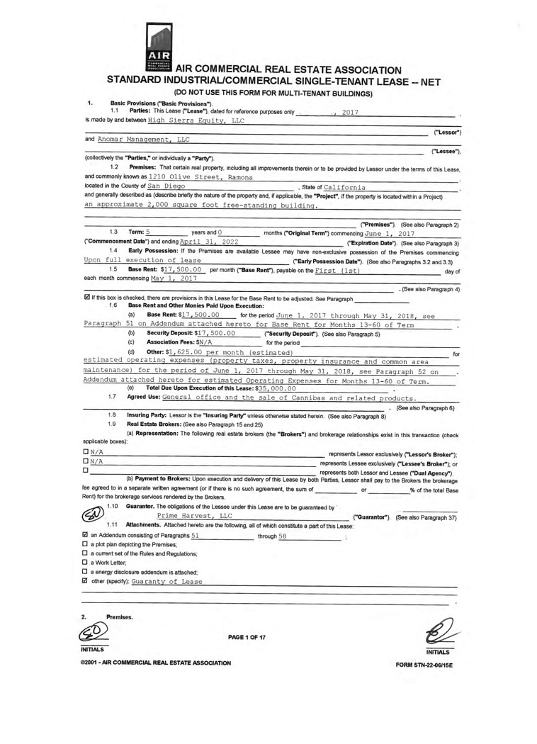 Olive Tree Wellness Center LLC license (San Diego County CUP #M-0004) is, for California licensing purposes, owned only 50% by the Company, and the Company is in the process of acquiring the remainder 50%, from Mr. Renny Bowden for $1,300,000. The Company’s City of La Mesa dispensary license (La Mesa CUP #317-85) is, for California licensing purposes, owned 100% by the Company.