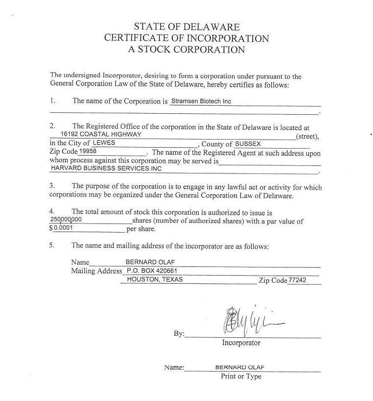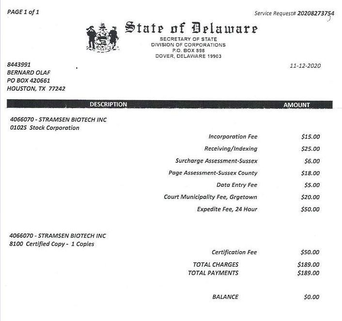We were founded on November 6th, 2020, as a Delaware corporation under the name Stramsen Biotech, Inc. Our principal executive offices are located at 5718 Westheimer Road Suite # 1000, 10th Floor, Houston, Texas 77057 and our telephone numbers are (713) 260-2622 - Toll free (800) 485-2110.
