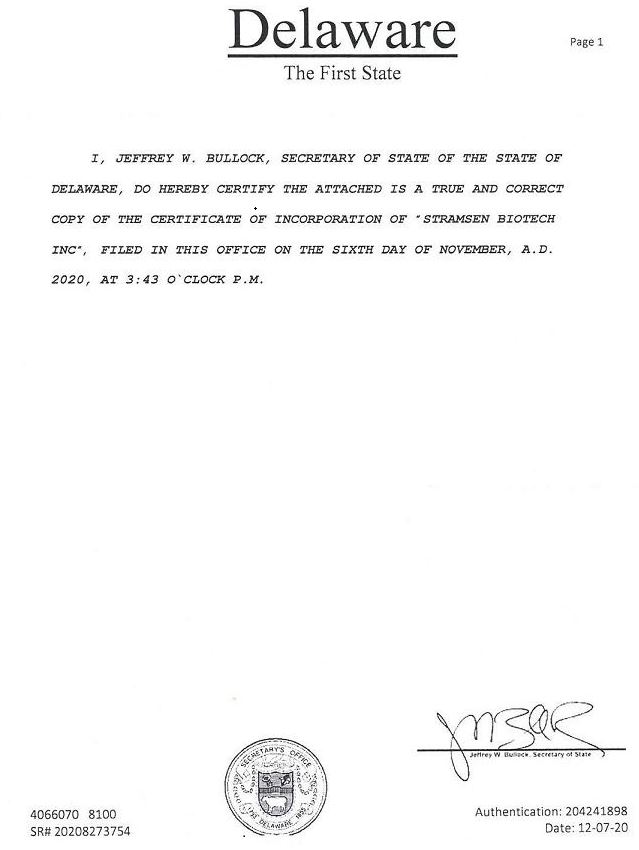 The undersigned hereby certifies that he is the duly elected, qualified and acting Secretary of STRAMSEN BIOTECH Inc., a Delaware corporation, and that the foregoing Amended and Restated Bylaws were adopted as the corporation’s bylaws, effective as of the date first set forth above, by the directors of the corporation.