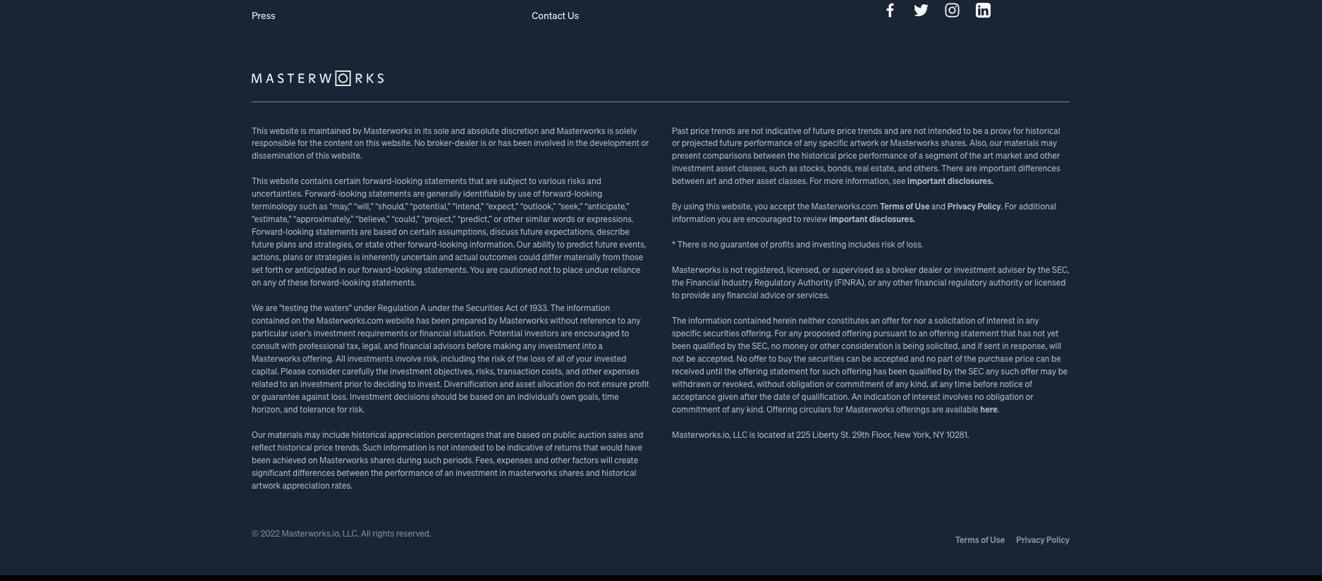Our principal office is located at 225 Liberty St., 29th Floor, New York, New York 10281 and our phone number is (203) 518-5172. Our corporate website address is located at www.masterworks.com. Information contained on, or accessible through, the website is not a part of, and is not incorporated by reference into, this offering circular.