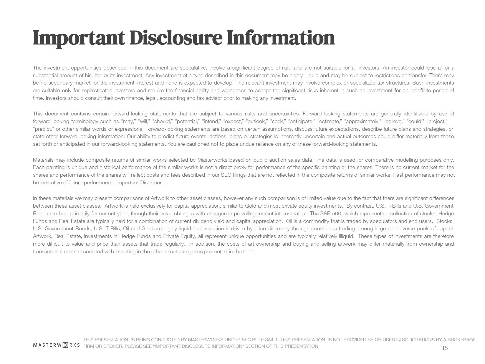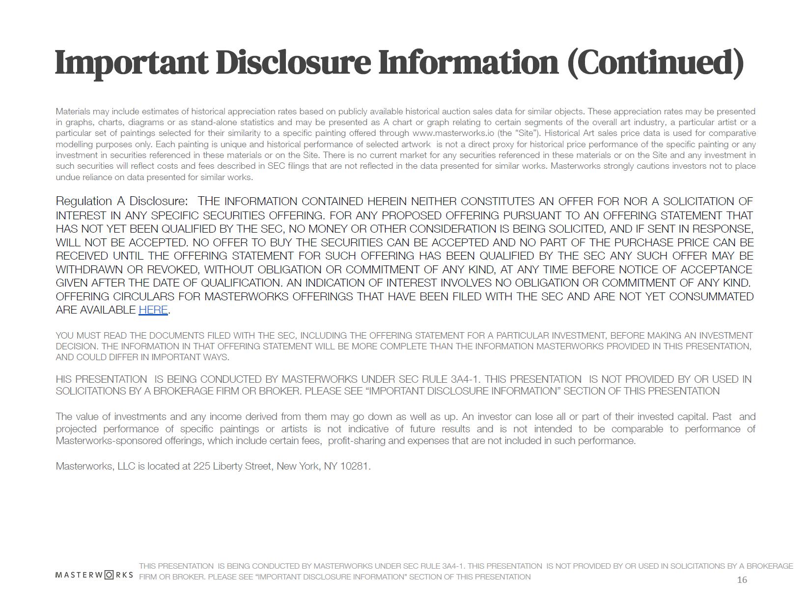 This offering circular is part of an offering statement that we filed with the SEC, using a continuous offering process pursuant to Rule 251(d)(3) of Regulation A, meaning that while the offering of securities is continuous, active sales of securities may happen sporadically over the term of the offering. Further, the acceptance of subscriptions, whether via the Masterworks Platform or otherwise, may be briefly paused at times to allow us to effectively and accurately process and settle subscriptions that have been received. Periodically, we will provide an offering circular supplement that may add, update or change information contained in this offering circular. Any statement that we make in this offering circular will be modified or superseded by any inconsistent statement made by us in a subsequent offering circular supplement. The offering statement we filed with the SEC includes exhibits that provide more detailed descriptions of the matters discussed in this offering circular. You should read this offering circular and the related exhibits filed with the SEC and any offering circular supplement, together with additional information contained in our annual reports, semi-annual reports and other reports and information statements that we will file periodically with the SEC. See the section entitled “Where You Can Find More Information” below for more details.