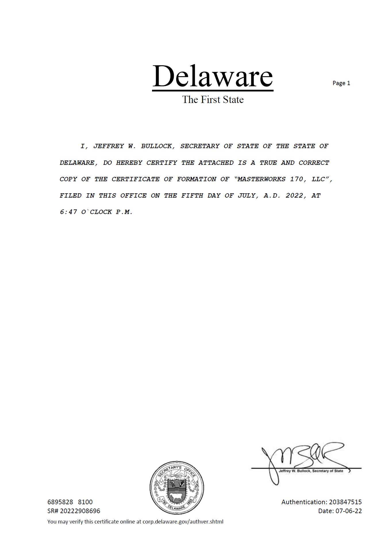 I have acted as counsel to Masterworks 170, LLC (the “Company”) in connection with the preparation and filing with the Securities and Exchange Commission of a Regulation A offering statement on Form 1-A, as filed on October 18, 2022 (the “Offering Statement”) relating to the offer by the Company of up to 77,700 of the Company’s membership interests in the form of Class A ordinary shares, for a purchase price of $20.00 per share (the “Shares”).