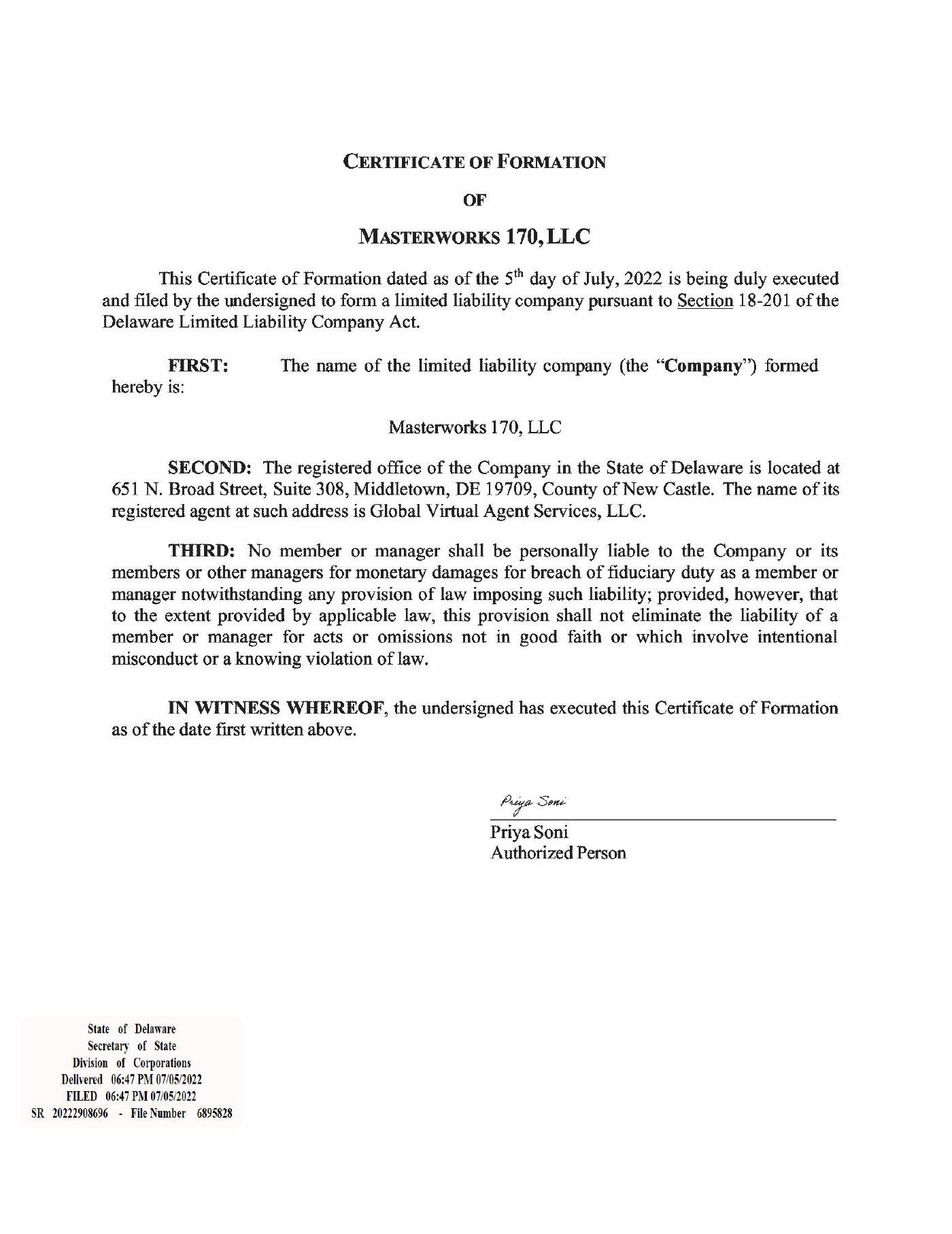 Re: Masterworks 170, LLC Offering Statement on Form 1-A