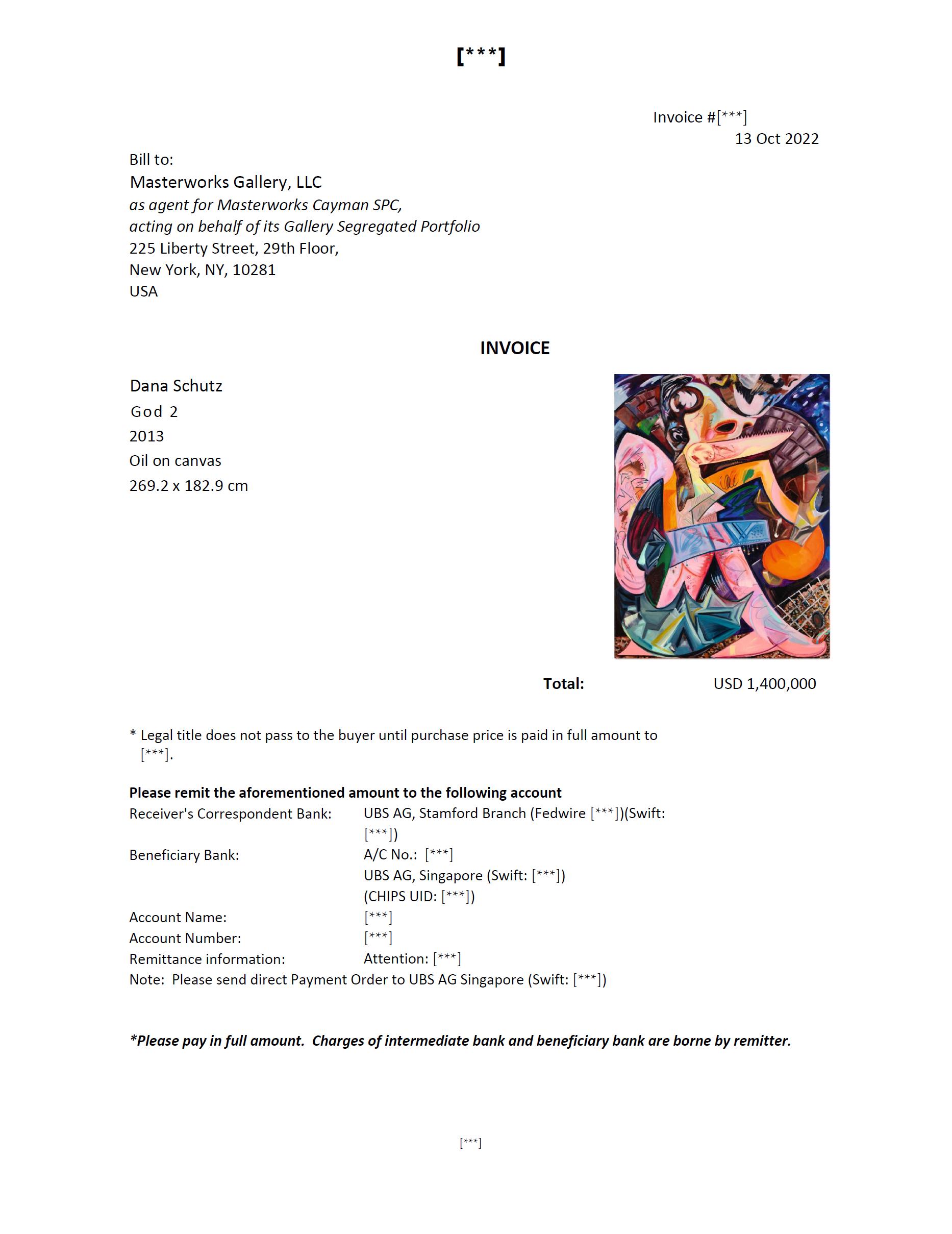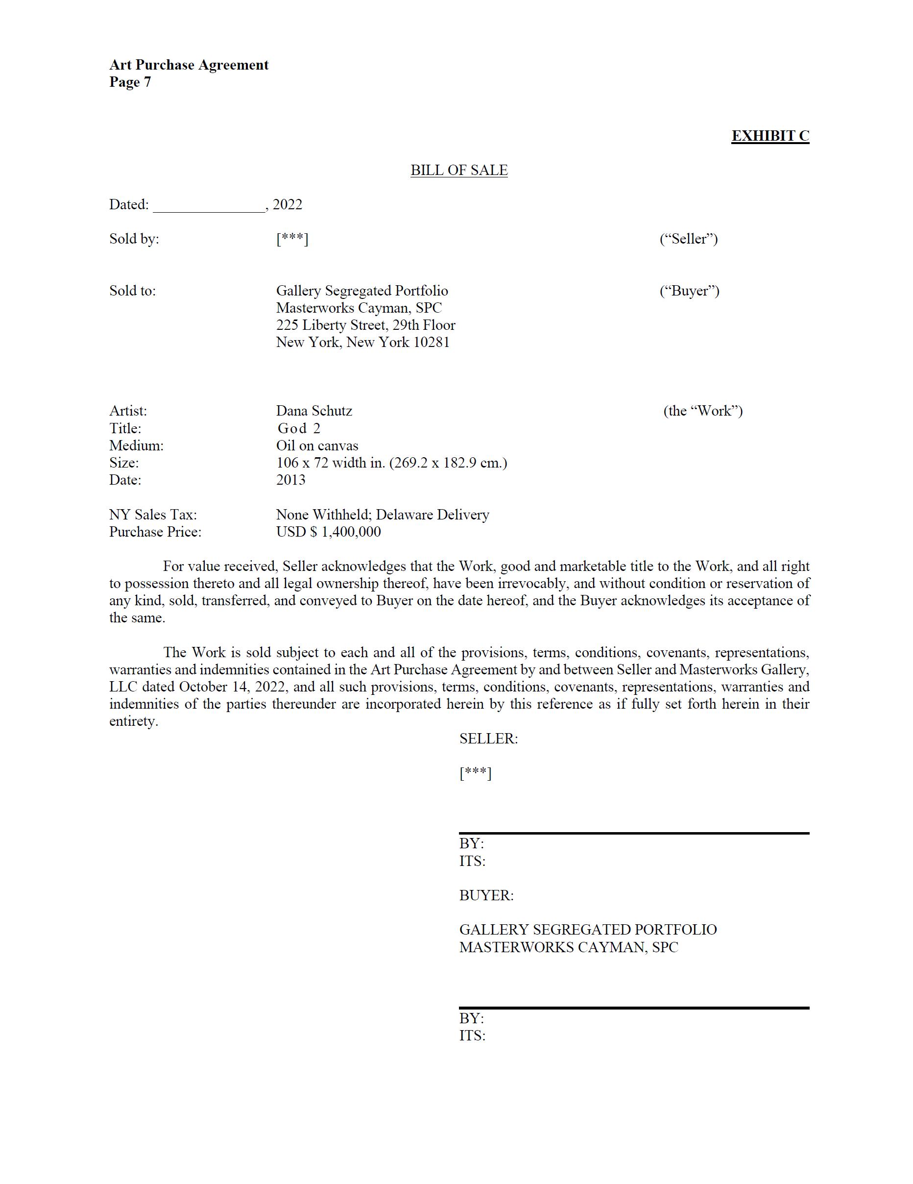 2. True-Up. Masterworks Gallery will be entitled to receive a true-up equal to 11% of the purchase price of the Artwork. The true-up will be deemed to be earned upon the acquisition of the Artwork by the segregated portfolio of Masterworks Cayman SPC that is wholly owned by the Company, but payment will be paid in installments upon each closing of the Offering in cash and or a combination of cash and Class A shares of the Company (valued at $20 per share for such purposes). Unless the Parties otherwise agree to a different allocation, each payment that occurs in connection with a closing of the Offering shall be prorated between the true-up and the advance based on the relative size of each obligation. Under no circumstances will any portion of the true-up remain as an outstanding obligation of the Company following the final closing of the Offering and the application of the use of proceeds therefrom.