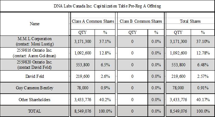 0001946688-22-000001.txt : 20220915 0001946688-22-000001.hdr.sgml : 20220915 20220915111449 ACCESSION NUMBER: 0001946688-22-000001 CONFORMED SUBMISSION TYPE: 1-A PUBLIC DOCUMENT COUNT: 79 FILED AS OF DATE: 20220915 FILER: COMPANY DATA: COMPANY CONFORMED NAME: DNALabs Canada Inc. CENTRAL INDEX KEY: 0001946688 IRS NUMBER: 981561597 STATE OF INCORPORATION: A6 FISCAL YEAR END: 1231 FILING VALUES: FORM TYPE: 1-A SEC ACT: 1933 Act SEC FILE NUMBER: 024-11994 FILM NUMBER: 221245018 BUSINESS ADDRESS: STREET 1: 99 YORKVILLE AVENUE STREET 2: SUITE 200 CITY: TORONTO STATE: A6 ZIP: M5R 3K5 BUSINESS PHONE: 519-953-4362 MAIL ADDRESS: STREET 1: 99 YORKVILLE AVENUE STREET 2: SUITE 200 CITY: TORONTO STATE: A6 ZIP: M5R 3K5 1-A 1 primary_doc.xml 1-A LIVE 0001946688 XXXXXXXX true false DNALabs Canada Inc. A6 2016 0001946688 8734 98-1561597 5 0 99 Yorkville Avenue Suite 200 Toronto A6 M5R 3K5 5189544362 Kendall Almerico Other 347527.00 0.00 50535.00 0.00 529300.00 192455.00 38386.00 265203.00 -1044059.00 529300.00 441716.00 205863.00 0.00 -169041.00 -25.59 -25.59 Daszkal Bolton LLC Class A Common 8549076 N/A N/A N/A 0 N/A N/A N/A 0 N/A N/A true true false Tier2 Audited Equity (common or preferred stock) Y N N Y N N 111111 0 9.0000 999999.00 0.00 0.00 0.00 999999.00 Dalmore Group 119999.99 Daszkal Bolton LLC 12500.00 Kendall A. Almerico PA 130000.00 136352 9699901.00 false true AL AK AZ AR CA CO CT DE DC FL GA HI ID IL IN IA KS KY LA ME MD MA MI MN MS MO MT NE NV NH NJ NM NY NC ND OH OK OR PA PR RI SC SD TN TX UT VT VA WA WV WI WY A0 A1 A2 A3 A4 A5 A6 A7 A8 A9 B0 Z4 AL AK AZ AR CA CO CT DE DC FL GA HI ID IL IN IA KS KY LA ME MD MA MI MN MS MO MT NE NV NH NJ NM NY NC ND OH OK OR PA PR RI SC SD TN TX UT VT VA WA WV WI WY A0 A1 A2 A3 A4 A5 A6 A7 A8 A9 B0 Z4 true EX1A-11 CONSENT 2 auditorsconsent.htm