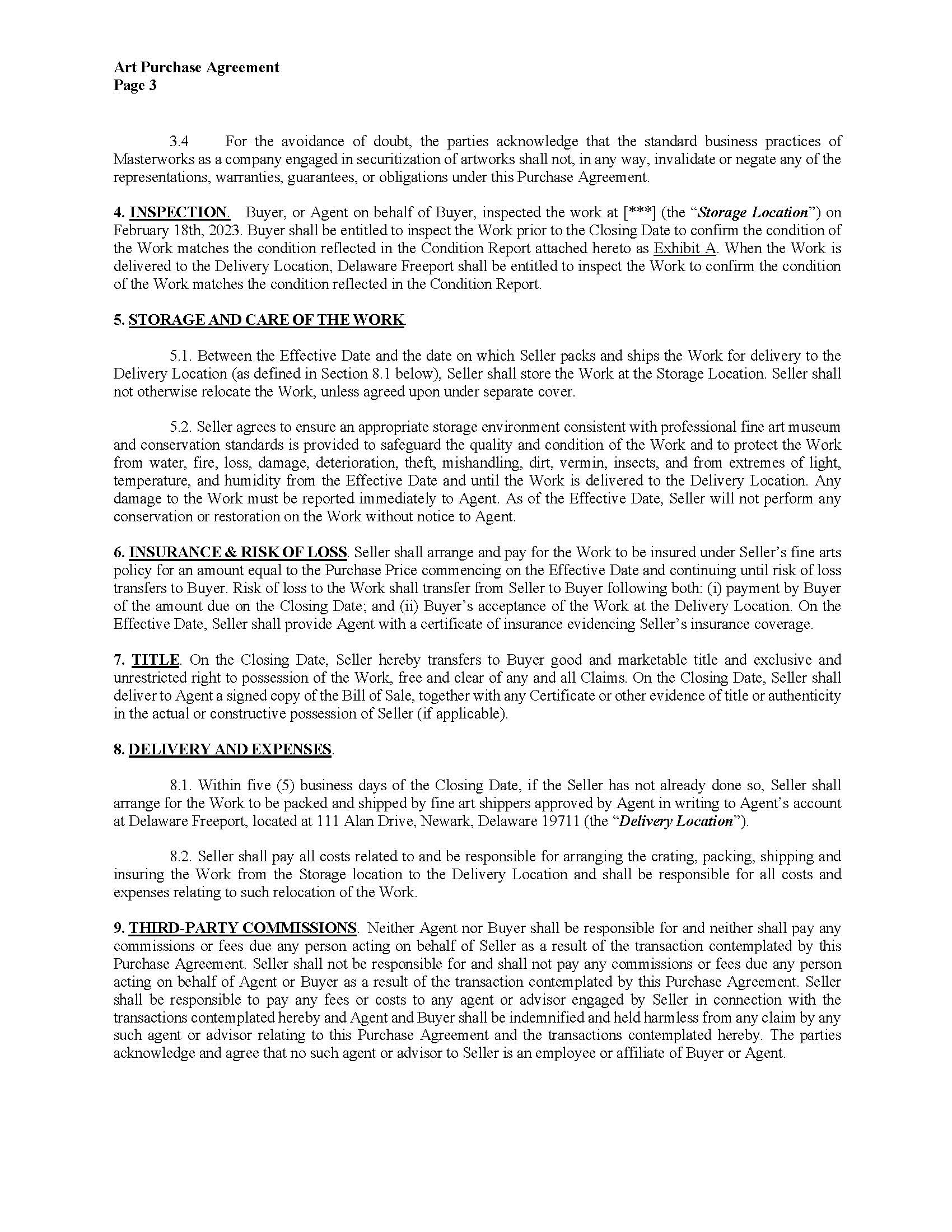 Acting as agent for the Company, Masterworks has agreed to acquire the Artwork at a purchase price of $665,000. Dollar amounts throughout this offering circular have been rounded to the nearest whole dollar and information such as auction sale prices, that were originally denominated in a currency other than the U.S. dollar have been converted into U.S. dollars at the prevailing exchange rate on the applicable date of such sale transaction per publicly available data.