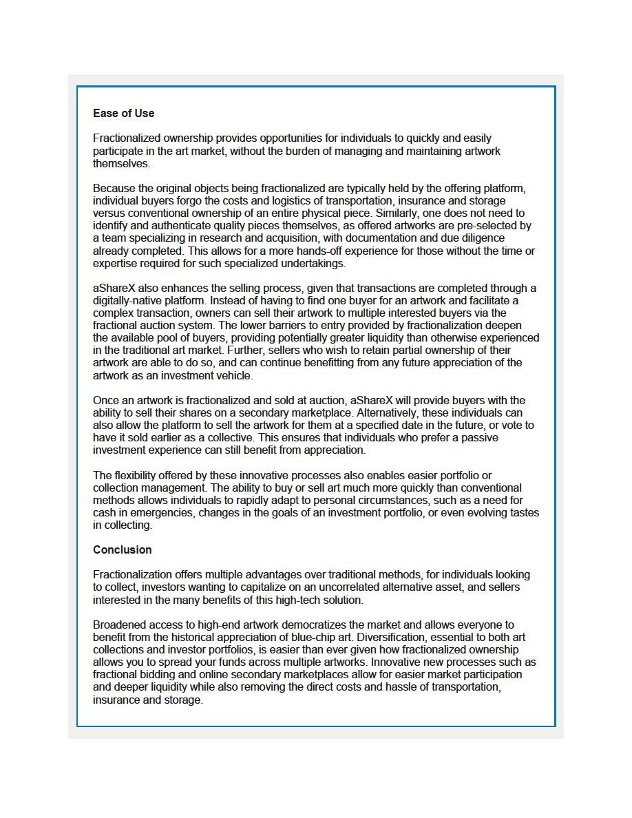 In sum, the aShareX innovative approach and proprietary technology allows potential investors to participate in heretofore cost-prohibitive fine art purchases by (i) providing rarely available, fact based knowledge concerning the Artwork, including initial and periodic third party appraisals, (ii) enabling an Investor to participate directly in the purchase without expensive middlemen and with real-time, market based, competitive pricing, (iii) providing the Investor with a low-cost liquidity alternative to an investment that is otherwise illiquid, (iv) allowing the Investor to benefit from the experience, expertise and sourcing capabilities of the aShareX principals and its advisory board (the “Advisory Board”), (v) enabling the Investor group to cause the Artwork to be sold in either the sixth or seventh years following its acquisition, and (vi) assuring the Investor of an exit event no later than the eighth anniversary of the Acquisition Date.
