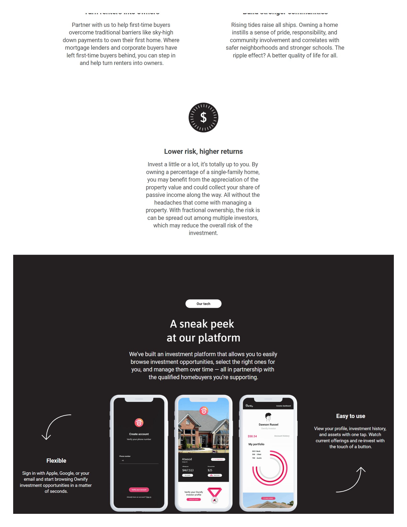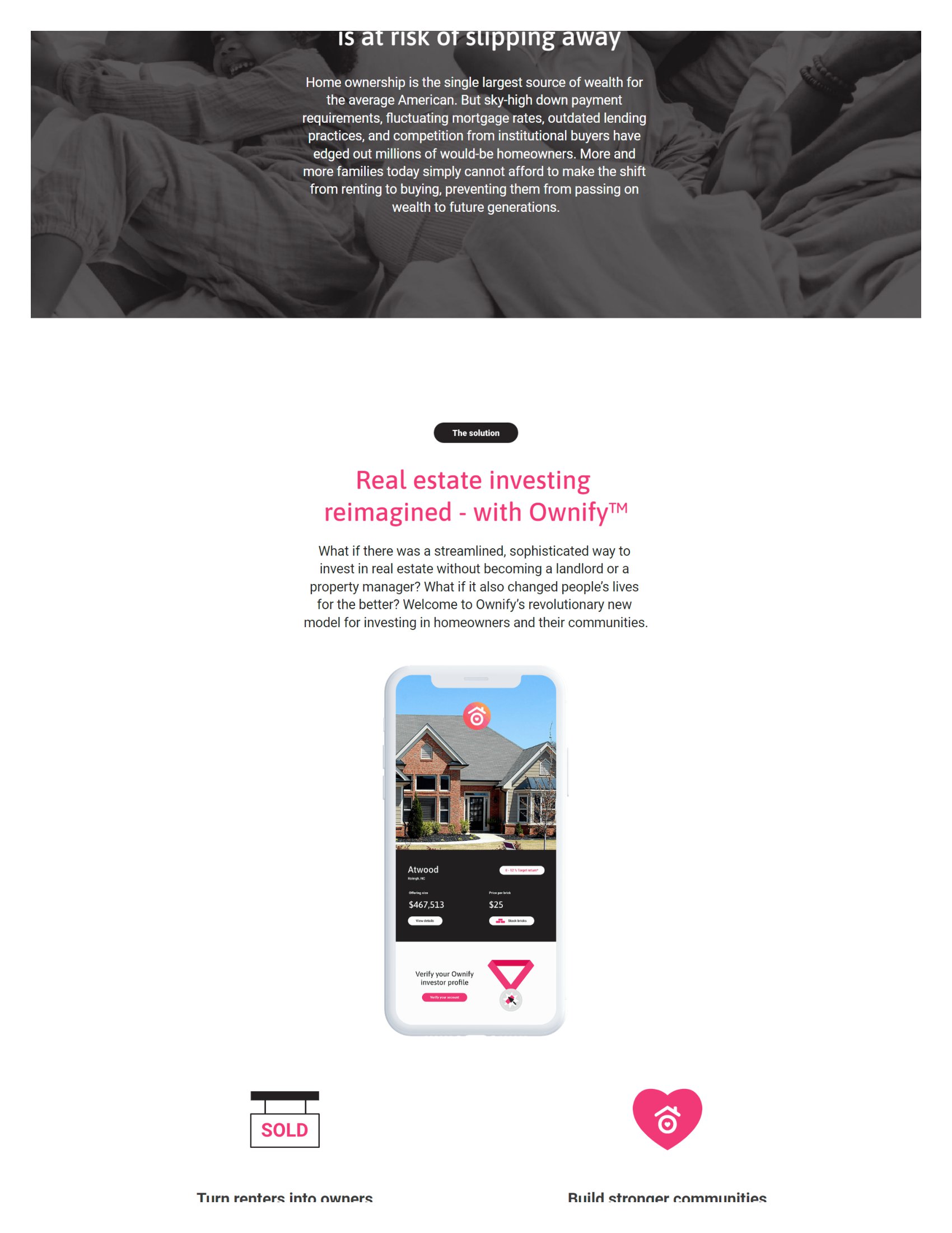 For our investors, Ownify offers fractional ownership in a single family home generating income and real estate returns, shared equity and shared purpose with the Owni, and positive community impact by helping first-time homebuyers.