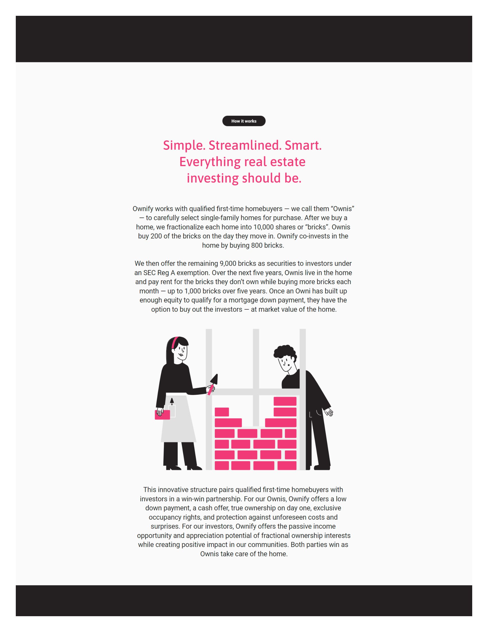 Ownify is a fractional ownership platform that partners socially conscious investors with qualified first-time homebuyers to buy their home “brick by brick”. With Ownify, homebuyers, which we refer to as “Ownis”, and investors together reap the collective benefits of building equity, creating stability, and investing in the health of local communities for years to come.