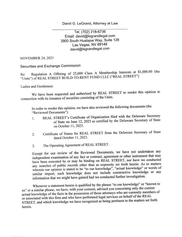 We consent to the incorporation in this Regulation A Offering Statement under the Securities Act of 1933 of REAL STREET BUILD-TO-RENT FUND I, LLC on Form 1-A, of our report dated August 9, 2023 with respect to our audit of the financial statements of REAL STREET BUILD-TO-RENT FUND I, LLC as of July 31, 2023 and for the period from June 12, 2023 (inception) to July 31, 2023, which report is included in this Registration Statement.