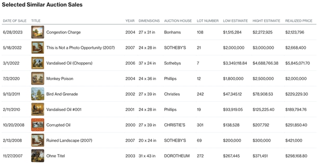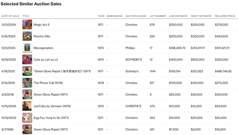 Masterworks is active in bidding in the auction market. If there is a sale of a work that Masterworks has purchased at public auction that qualifies as comparable to the Artwork, the comparable sale may be included in the comparable data set at the discretion of the Masterworks Appraiser(s), provided that the related party nature of the comparable sale will be noted in the appraisal.