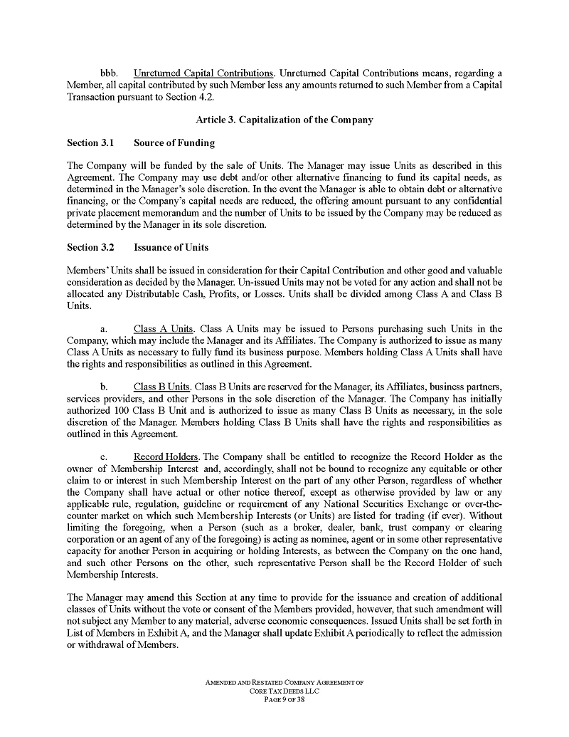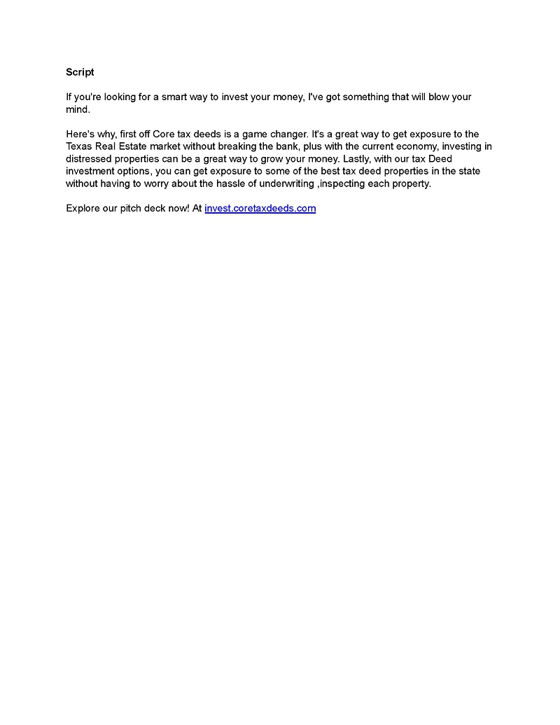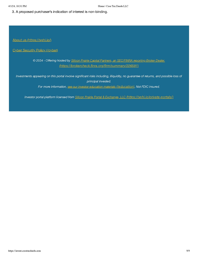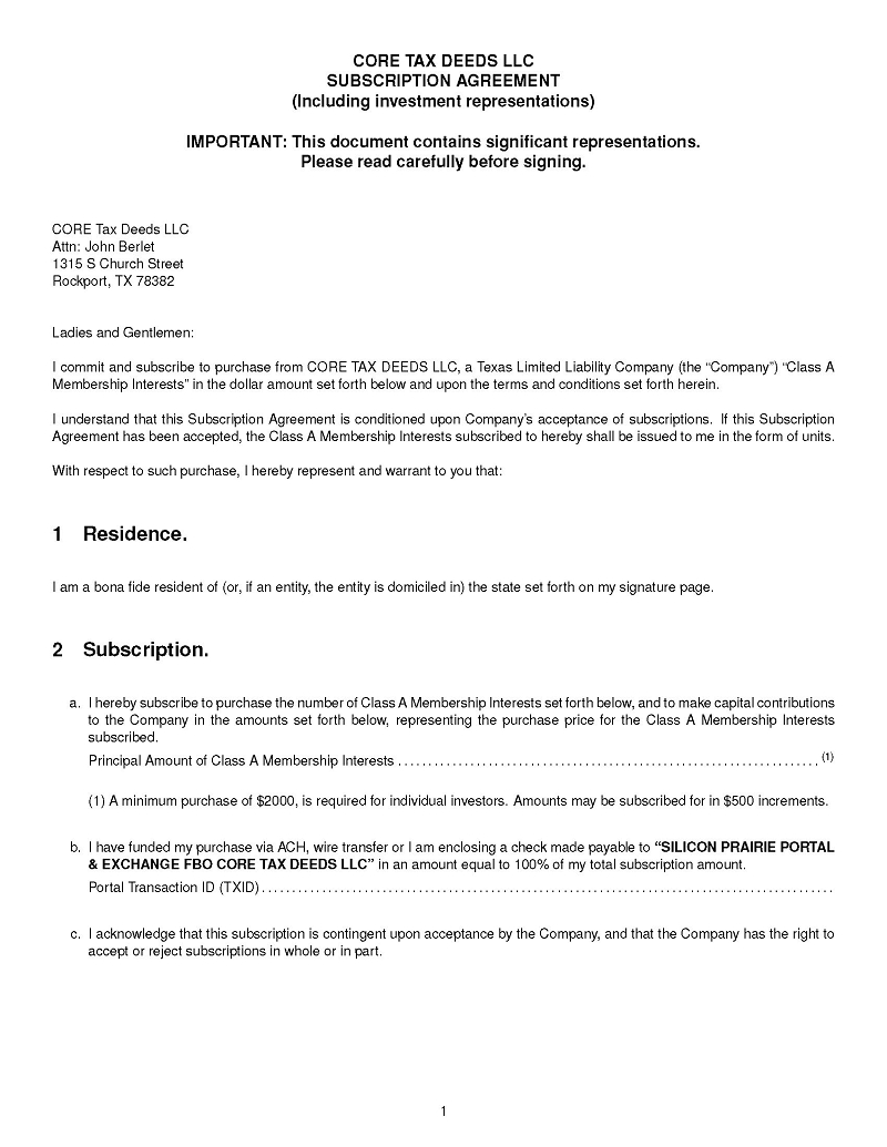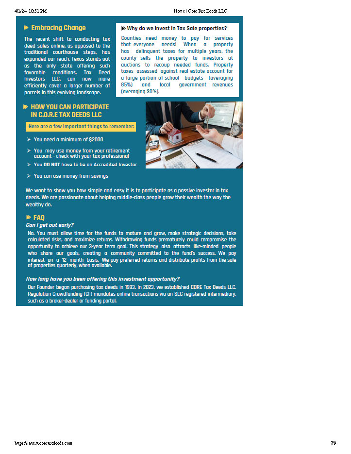 CORE Tax Deeds LLC (the “Company,” “we,” “us”, or “our”), is offering a minimum amount of $50,000.00 (the “Target Offering Amount”) and up to a maximum amount of $5,000,000.00 (the “Maximum Offering Amount”) of the Company’s class A membership interests (the “Securities” or “Class A Interests”) in the form of units (“Units) at a price of $10.00 per Class A Interest (this “Offering”). The minimum amount that an investor may invest in the Offering is $2,000.00 and subscriptions must be made in $500.00 increments, subject to adjustment in the Company’s sole discretion. We must raise an amount equal to or greater than the Target Offering Amount by April 05, 2025 (the “Offering Deadline”). Unless we raise at least the Target Offering Amount by the Offering Deadline, no Securities will be sold in this Offering, all investment commitments will be cancelled, and all committed funds will be returned without interest or deduction.
